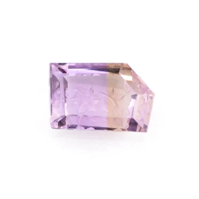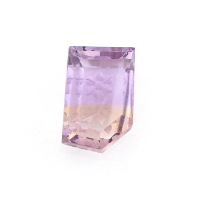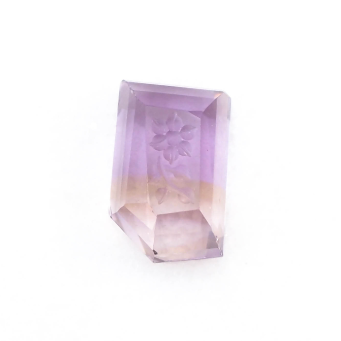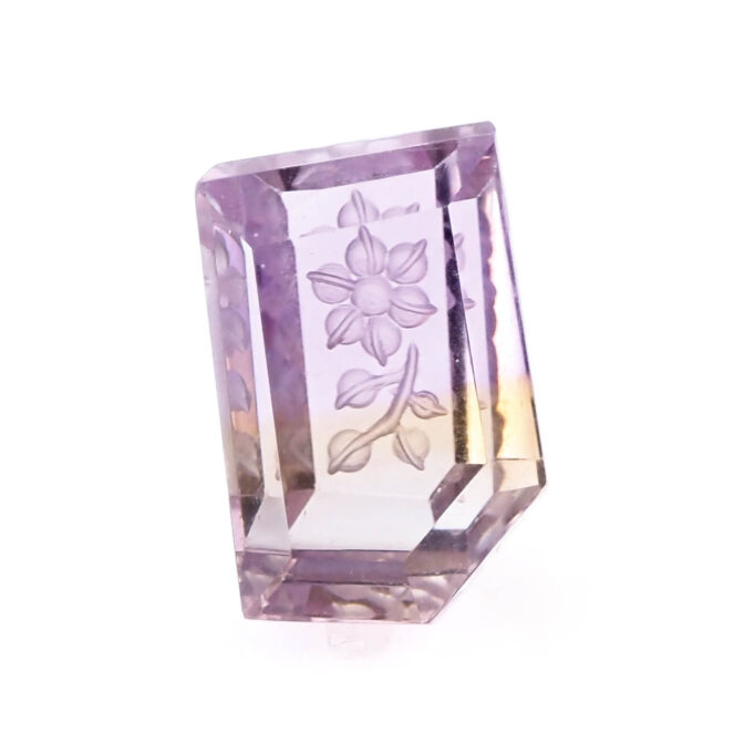 このページでご紹介しているアメトリンのインタリオは、本来無機物である鉱物に、まるで生命を持つかのような花が柔らかく咲き誇るように彫り込まれています。花びら一枚一枚、ため息が出るほど美しい繊細さ。原石の形を活かしたフリーカットのシェイプもユニークで、直線的なカットがいきいきとした力強さです。目立つインクルージョンがないクリアなアメトリンを使用しているのも、インタリオをより輝かせています。