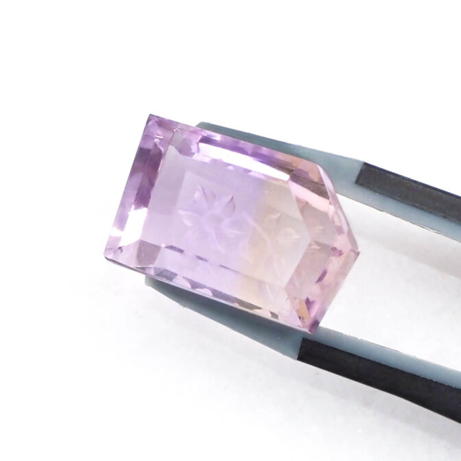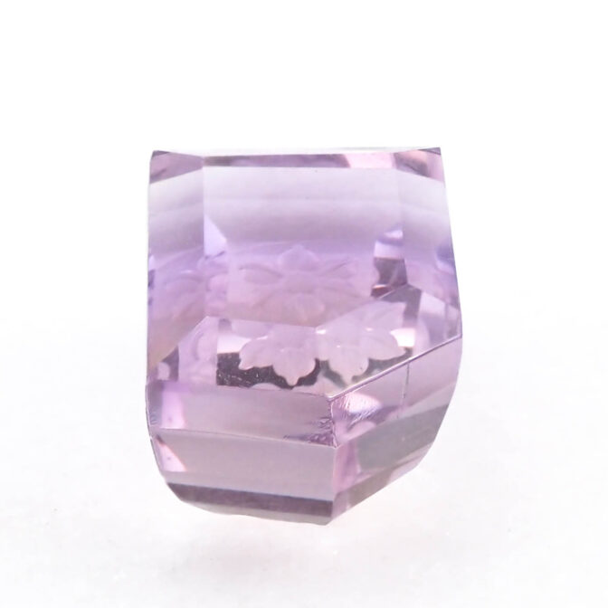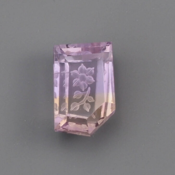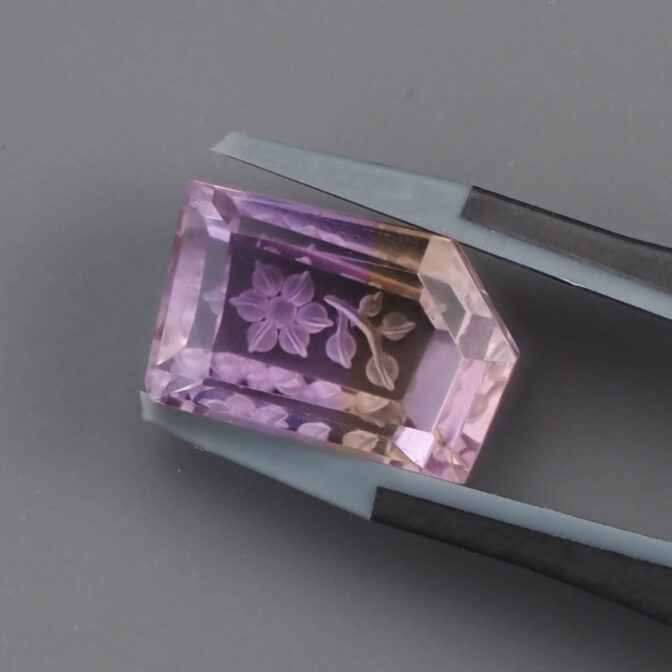 とてもユニークで人気があるアメトリンにさらにひと工夫。裏から模様を彫り込む「インタリオ」の技法で、美しく咲き誇る花を表現しています。このインタリオという技法は、表から見せる模様を裏から彫るため、とても手間がかかります。少し彫り進めては裏返し、見え方を確認しつつ調整を加えるという工程を繰り返すので、通常の浮き彫りよりも手間と時間がかかるのです。