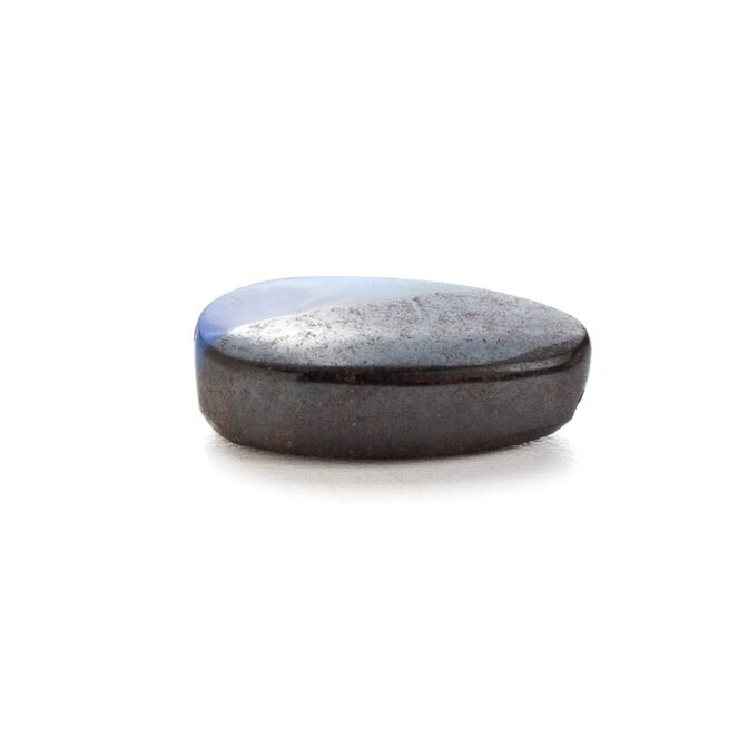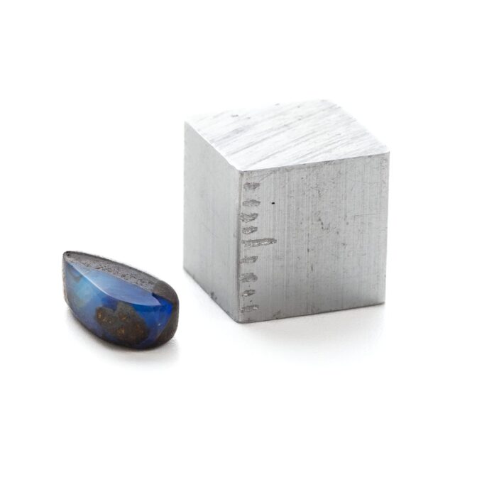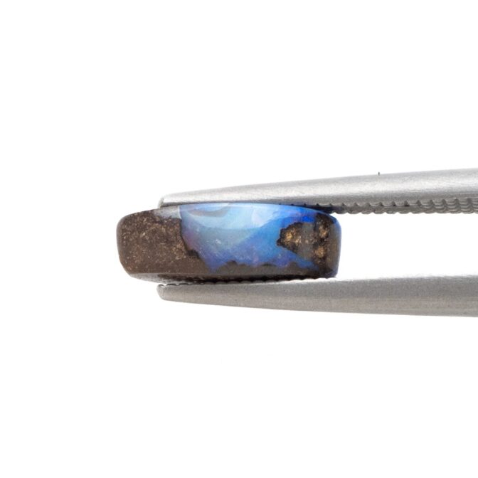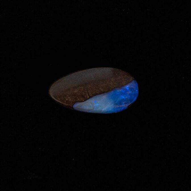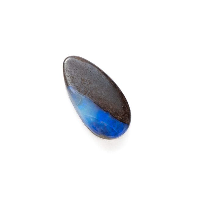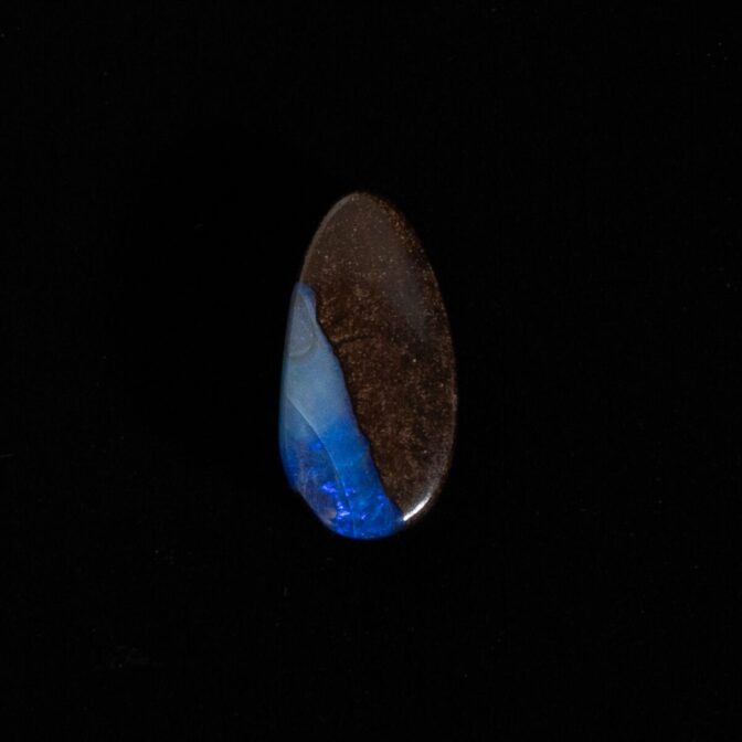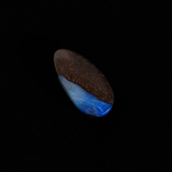 このページでご紹介しているボルダーオパールは、大変状態がよく、質も良いデッドストック。香港に買い付けに行った際、オーナーすら存在を忘れていたという逸話があります。引退するオパール専門店からまとめて引き取ったものの、数が多すぎてジュエリーにするにも手が届かず、持て余していたとのこと。なるほど、ジュエリー用だったからこその質の良さなのですね。上質なボルダーオパールは、カラット数を保つため、どうしても大粒になりがち。ですが今回のロットはやや小さめに形よくカットされ、ジュエリーにぴったりサイズなのが嬉しいところ。漆黒に艶めく母岩の間からチカチカと星のように瞬く遊色は鮮やかな紺色。鮮烈な輝きが黒い母岩から湧き出す様子はまるで夜空を走り抜ける雷鳴のよう。シックなのに華やかという相反する要素を持つ、2面性があるルースです。