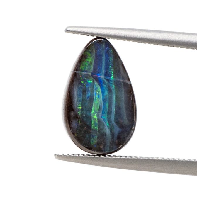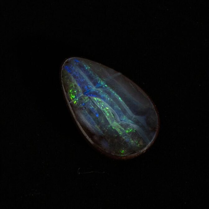 母岩の中にオパール層が入り込み、形成されるボルダーオパール。母岩の隙間からほとばしる遊色の輝きと、模様のように入り組んだ鉱物たちが織りなす美しさは、芸術品の域に達します。主にオーストラリアで産出しますが、残念ながら年々採掘量が減っており、価格が急騰している石の一つでもあります。