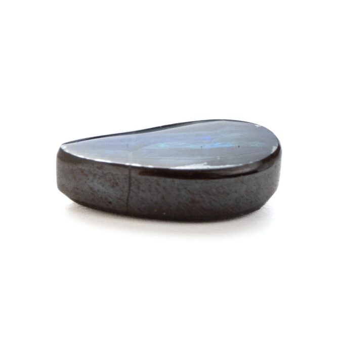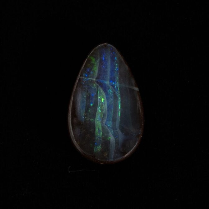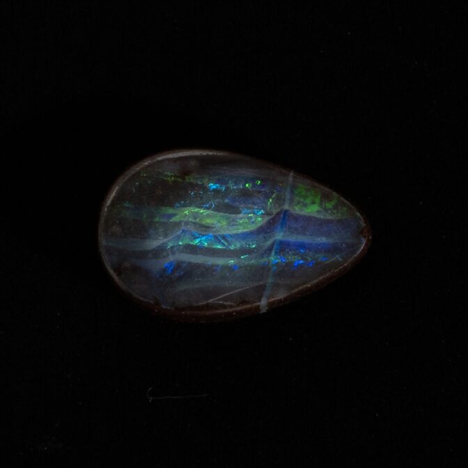 このページでご紹介しているボルダーオパールは、大変状態がよく、質も良いデッドストック。香港に買い付けに行った際、オーナーすら存在を忘れていたという逸話があります。引退するオパール専門店からまとめて引き取ったものの、数が多すぎてジュエリーにするにも手が届かず、持て余していたとのこと。なるほど、ジュエリー用だったからこその質の良さなのですね。上質なボルダーオパールは、カラット数を保つため、どうしても大粒になりがち。ですが今回のロットはやや小さめに形よくカットされ、ジュエリーにぴったりサイズなのが嬉しいところ。漆黒に艶めく母岩の間からチカチカと星のように瞬く遊色は鮮やかな紺色。鮮烈な輝きが黒い母岩から湧き出す様子はまるで夜空を走り抜ける雷鳴のよう。シックなのに華やかという相反する要素を持つ、2面性があるルースです。
