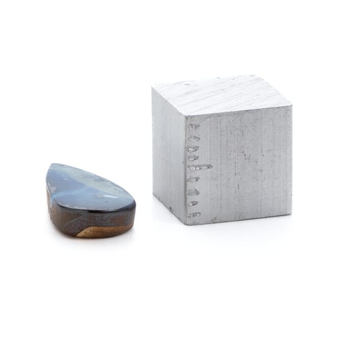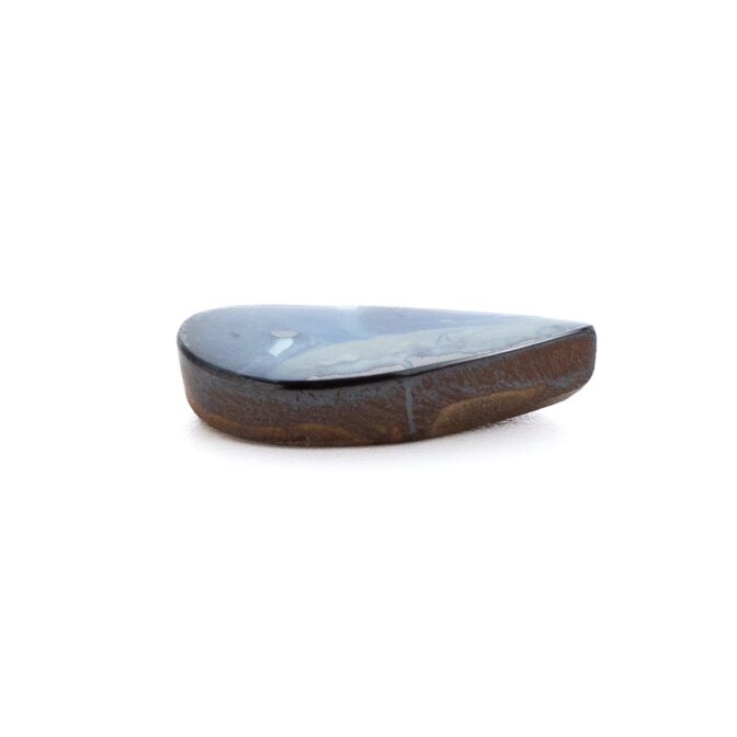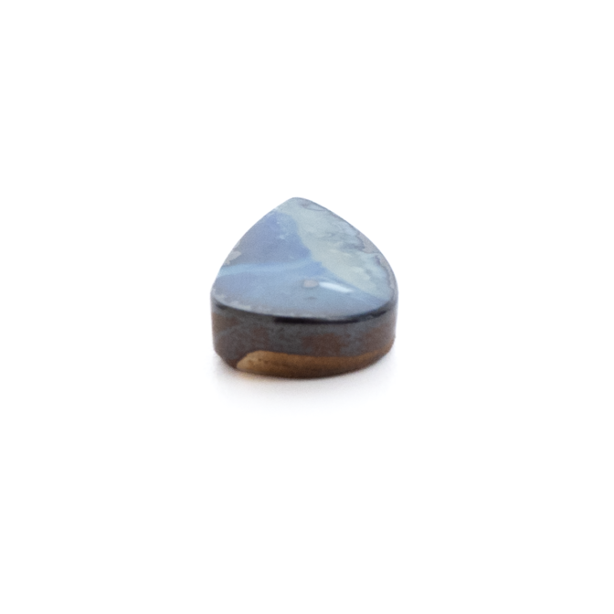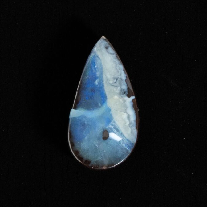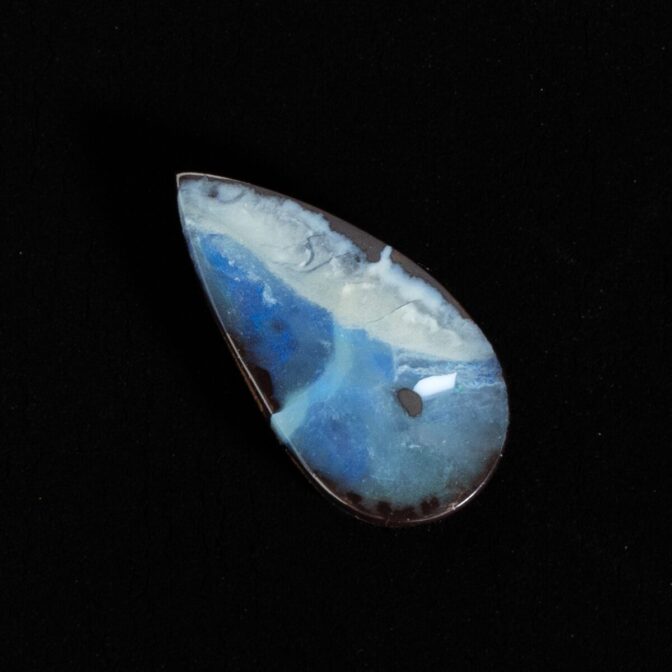 このページでご紹介しているボルダーオパールは、大変状態がよく、質も良いデッドストック。香港に買い付けに行った際、オーナーすら存在を忘れていたという逸話があります。引退するオパール専門店からまとめて引き取ったものの、数が多すぎてジュエリーにするにも手が届かず、持て余していたとのこと。なるほど、ジュエリー用だったからこその質の良さなのですね。上質なボルダーオパールは、カラット数を保つため、どうしても大粒になりがち。ですが今回のロットはやや小さめに形よくカットされ、ジュエリーにぴったりサイズなのが嬉しいところ。漆黒に艶めく母岩の間からチカチカと星のように瞬く遊色は鮮やかな紺色。鮮烈な輝きが黒い母岩から湧き出す様子はまるで夜空を走り抜ける雷鳴のよう。シックなのに華やかという相反する要素を持つ、2面性があるルースです。
