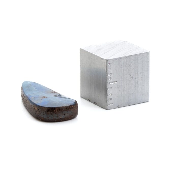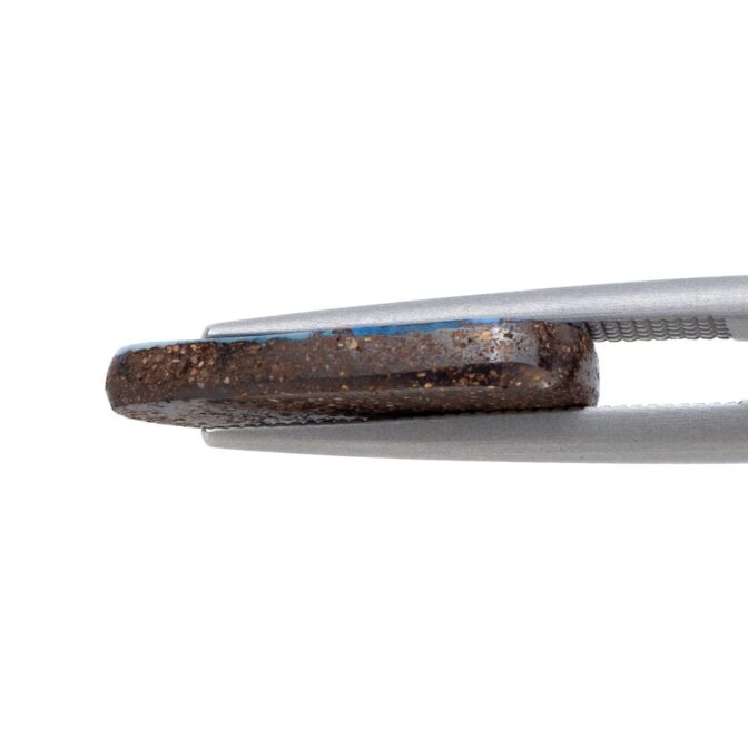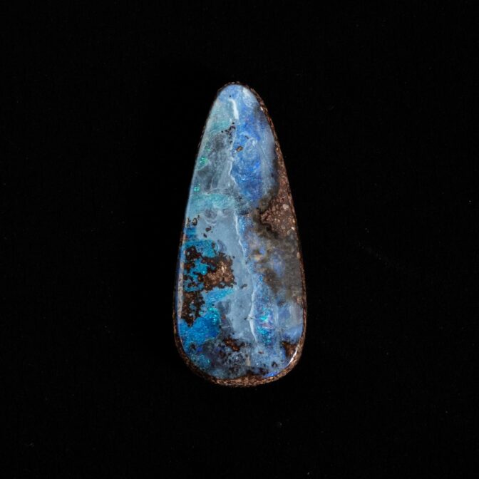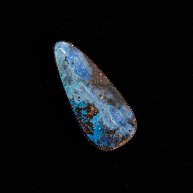 このページでご紹介しているボルダーオパールは、大変状態がよく、質も良いデッドストック。香港に買い付けに行った際、オーナーすら存在を忘れていたという逸話があります。引退するオパール専門店からまとめて引き取ったものの、数が多すぎてジュエリーにするにも手が届かず、持て余していたとのこと。なるほど、ジュエリー用だったからこその質の良さなのですね。上質なボルダーオパールは、カラット数を保つため、どうしても大粒になりがち。ですが今回のロットはやや小さめに形よくカットされ、ジュエリーにぴったりサイズなのが嬉しいところ。漆黒に艶めく母岩の間からチカチカと星のように瞬く遊色は鮮やかな紺色。鮮烈な輝きが黒い母岩から湧き出す様子はまるで夜空を走り抜ける雷鳴のよう。シックなのに華やかという相反する要素を持つ、2面性があるルースです。