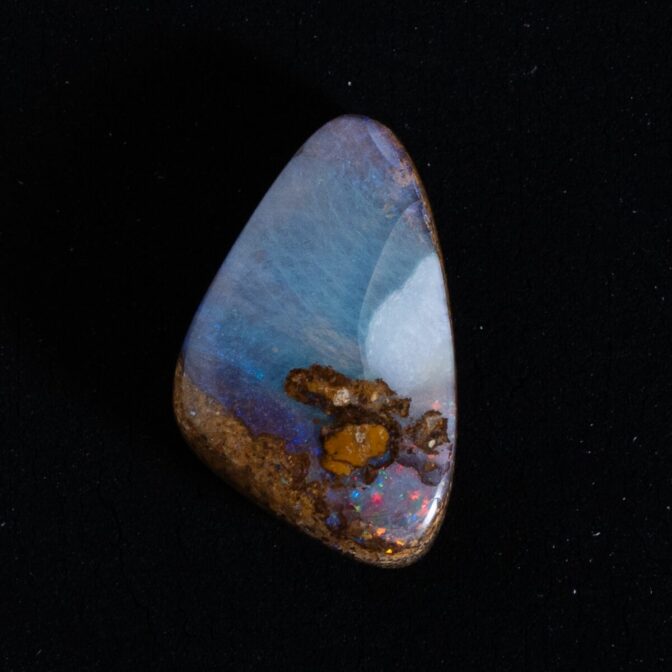 母岩とオパール層の色によって雰囲気がガラリと変わるのが、ボルダーオパールの面白いところ。明るい色の母岩と暗い色のオパールを選べば、その明暗の差が美しく、明るいオパール層と明るい色の母岩だと、華やかな雰囲気に見えます。また、暗い色の母岩に暗い色のオパールの組み合わせは、遊色の輝きが一段と美しく、深い魅力をたたえて静かに輝きます。一つとして同じ石はなく、いくら集めても満足するというところまで辿り着けない、そんな深遠なる神秘を宿す、魅惑的な石なのです。