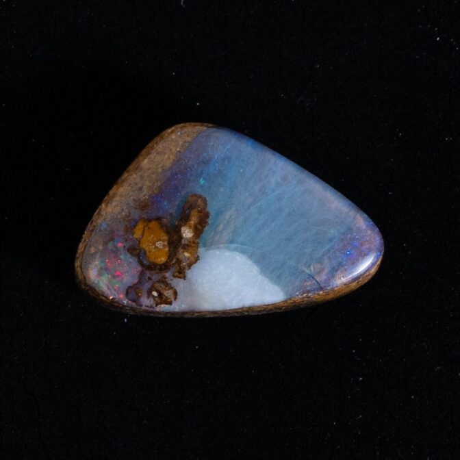 母岩の中にオパール層が入り込み、形成されるボルダーオパール。母岩の隙間からほとばしる遊色の輝きと、模様のように入り組んだ鉱物たちが織りなす美しさは、芸術品の域に達します。主にオーストラリアで産出しますが、残念ながら年々採掘量が減っており、価格が急騰している石の一つでもあります。