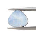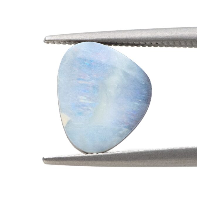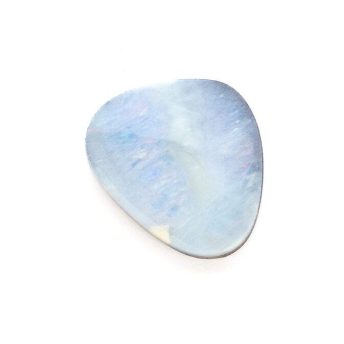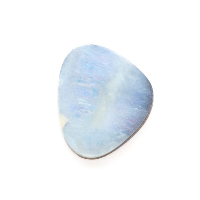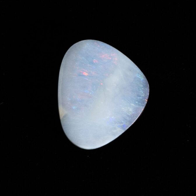 このページでご紹介しているボルダーオパールは、大変状態がよく、質も良いデッドストック。香港に買い付けに行った際、オーナーすら存在を忘れていたという逸話があります。引退するオパール専門店からまとめて引き取ったものの、数が多すぎてジュエリーにするにも手が届かず、持て余していたとのこと。なるほど、ジュエリー用だったからこその質の良さなのですね。上質なボルダーオパールは、カラット数を保つため、どうしても大粒になりがち。ですが今回のロットはやや小さめに形よくカットされ、ジュエリーにぴったりサイズなのが嬉しいところ。珍しいことに、まるで季節外れの雪のように、柔らかなトーンの真っ白なオパール層を持ち、赤や青紫の柔らかい遊色がふんわりと輝きます。シックなのに華やかという相反する要素を持つ、2面性があるルースです。