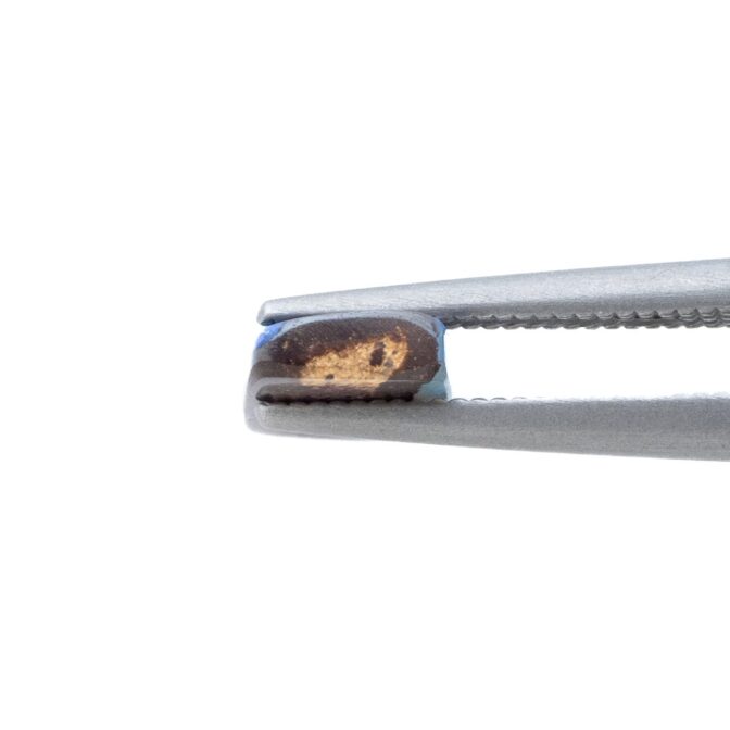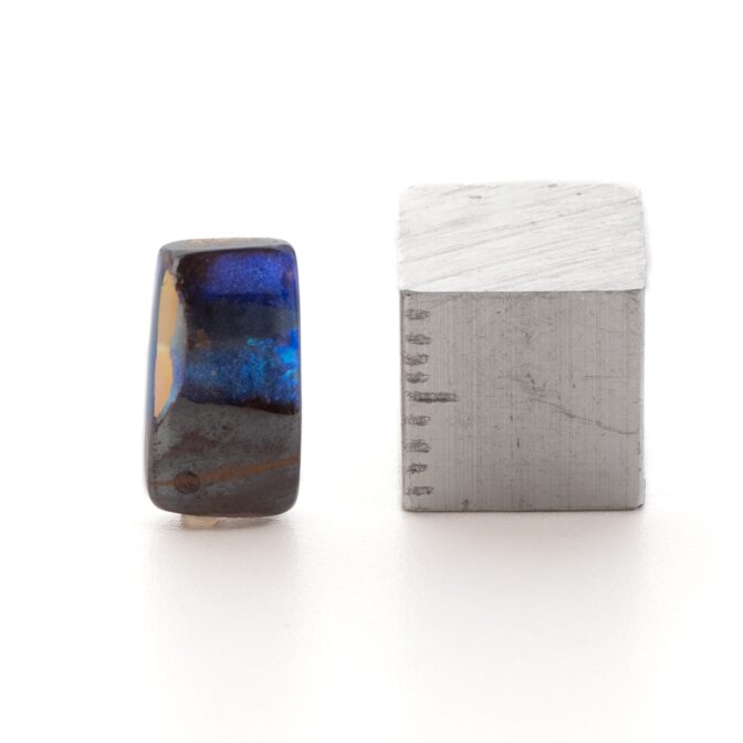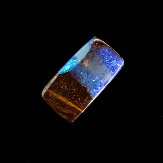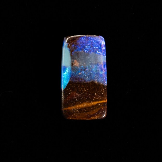 このページでご紹介しているボルダーオパールは、大変状態がよく、質も良いデッドストック。香港に買い付けに行った際、オーナーすら存在を忘れていたという逸話があります。引退するオパール専門店からまとめて引き取ったものの、数が多すぎてジュエリーにするにも手が届かず、持て余していたとのこと。なるほど、ジュエリー用だったからこその質の良さなのですね。上質なボルダーオパールは、カラット数を保つため、どうしても大粒になりがち。ですが今回のロットはやや小さめに形よくカットされ、ジュエリーにぴったりサイズなのが嬉しいところ。母岩と深い藍色の遊色を持つオパール層の対比が美しく、端にみずみずしく透明なオパールがあり、アクセントになっているところもポイントです。