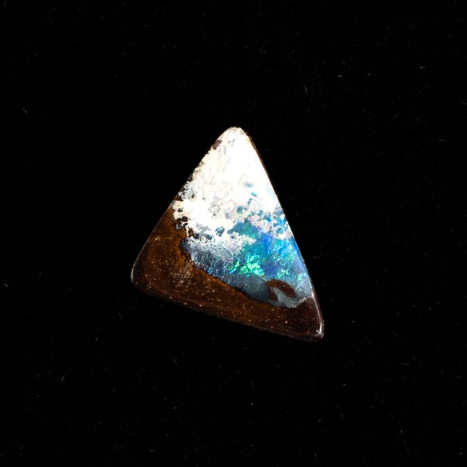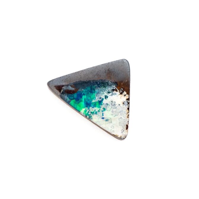上質なボルダーオパールは、カラット数を保つため、どうしても大粒になりがち。ですが今回のロットはやや小さめに形よくカットされ、ジュエリーにぴったりサイズなのが嬉しいところ。整った形の三角形にカットされたルースは、中でも珍しく汎用性が高いのが魅力。艶めくブラウンと、ブルーとグリーン2色に輝く遊色、真っ白な雪のような母岩など、ボルダーオパールならではの美しさがたっぷり詰まっています。