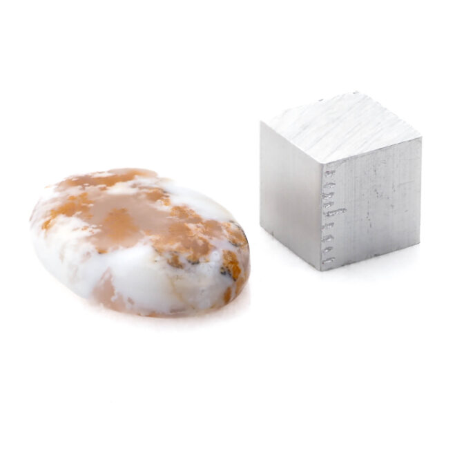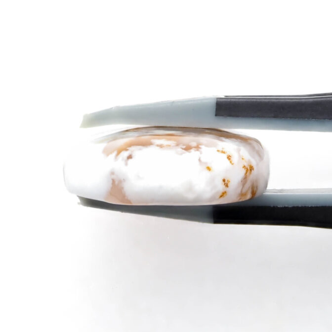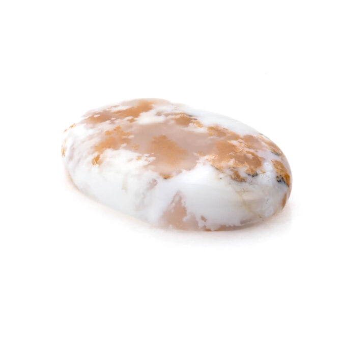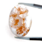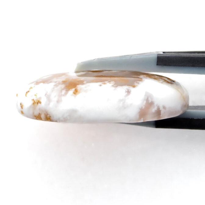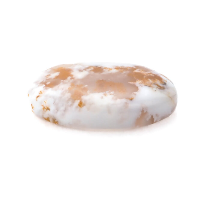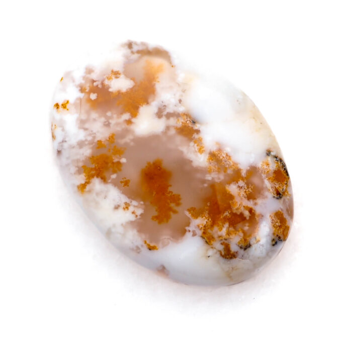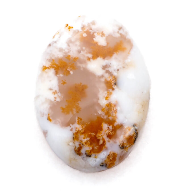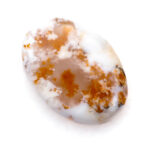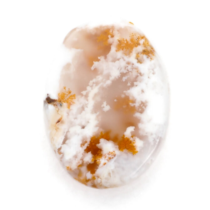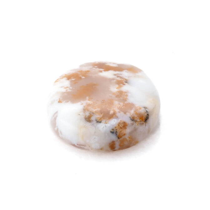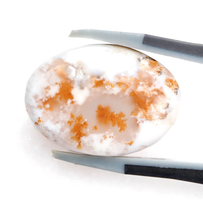 コモンオパールの中でも面白いのがこのページでご紹介しているデンドライトオパール。「デンドライト」とはギリシャ語で「樹形」のこと。その名の通り植物の形にも見える黒や褐色のインクルージョンを持つコモンオパールのことです。このインクルージョンの一つ一つが唯一無二の世界観を創造し、たまらなく魅力的な一点もののルースを生み出しているのです。そして、大変珍しい色合いにもご注目ください。柔らかく透き通る半透明から、パキッとした鮮烈なホワイトカラーへのグラデーションが見事。鮮やかなオレンジのインクルージョンも大きな特徴です。まるで、紅葉に色づく木の葉をイメージさせ、景色を閉じ込めたかのよう。つるりと磨かれ、つやつやと光を反射する様もとても上品かつ可愛らしいです。