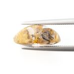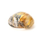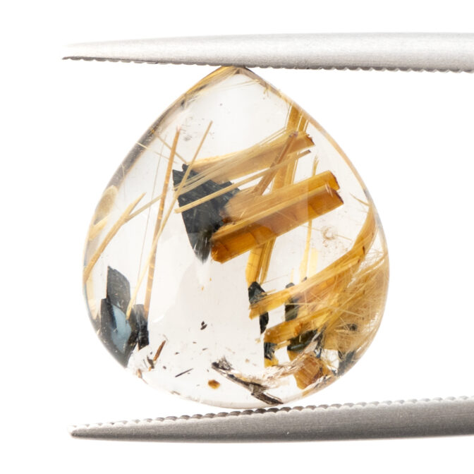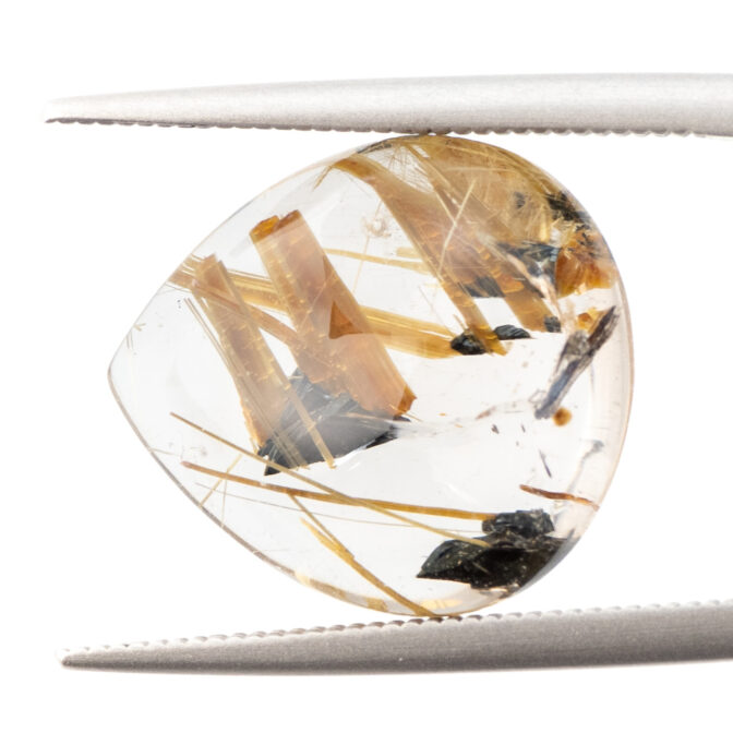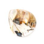 つやっつやのぷりぷり。ふっくら丸みのあるシェイプにレンズのように見えるほど磨かれた透明なクォーツが類まれな美しさ。その中に黒いヘマタイトと、すらりとのびる黄金のルチルが骨太な魅力。厚みがあるカットだからできる、立体感ある太陽ルチルの見え方が型にはまらぬ輝きです。リズミカルなルチルの配置が芸術的で、漆黒のヘマタイトとの対比が実に見事。混じり気のない、澄みきった黄金の輝きが華々しいルースです。
