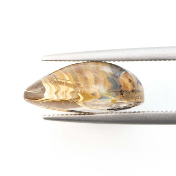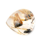 このページでご紹介しているルースは、太陽ルチルとしてはやや変則的。しかし、まっさらな透明度を誇る澄んだクォーツの中に、絶妙なバランスで配置されているルチルにはデザイン性があり、とても洗練された印象です。丁寧に、つややかに磨かれたクォーツの輝きも素晴らしく、太陽ルチルと同じくらい私たちの目を釘付けにしてしまいます。スタンダードな太陽ルチルは一通り集めてしまった、というマニアの方にもおすすめです。