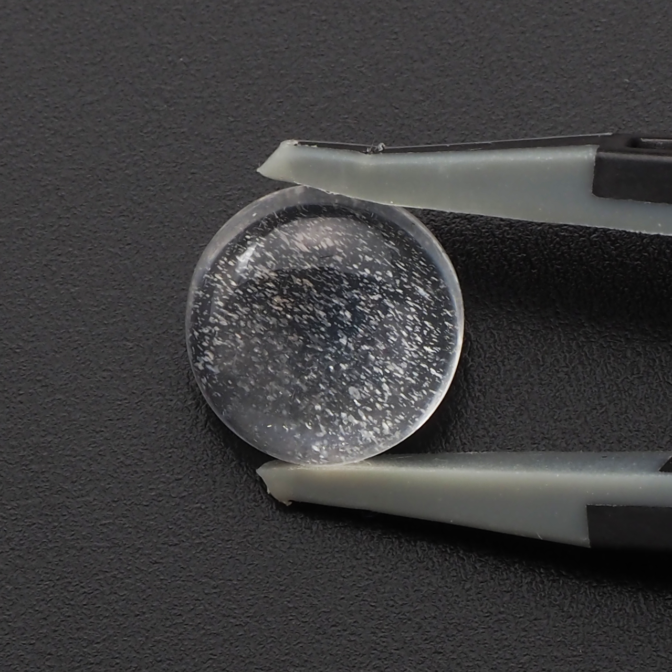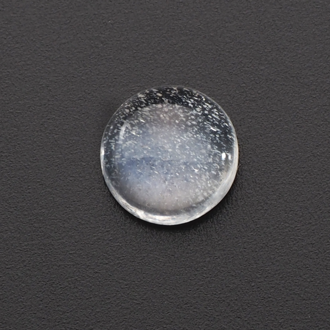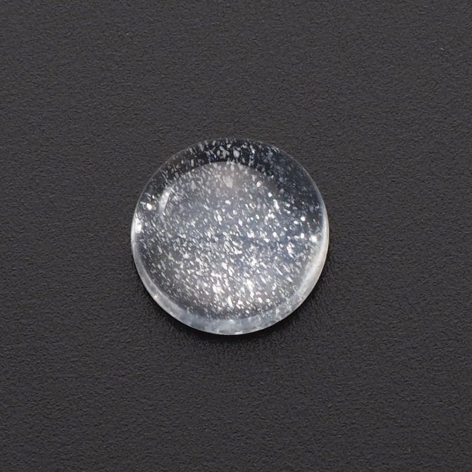 宇宙に輝く銀河を石の中に閉じ込めたような、インクルージョンがキラキラと輝く魅惑的なペリステライト。なだらかなドーム状に研磨されたカボションの表面に、青く神秘的なペリステリズム(シラー)がひらめきます。清楚で抑制された雰囲気の中、インクルージョンの華やかな銀色が一際映える美しいルースです。
