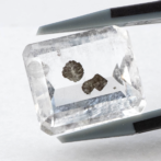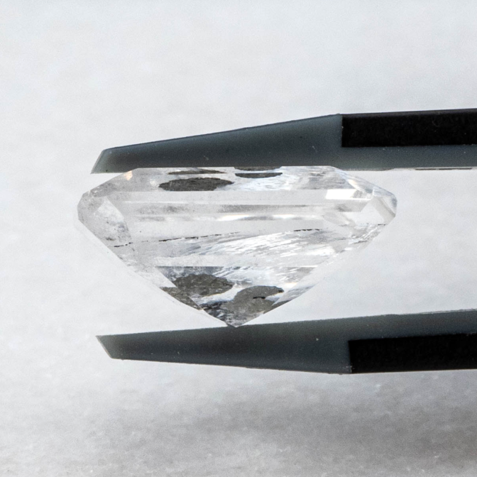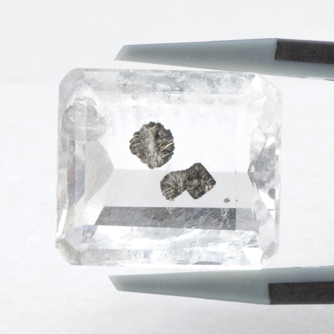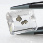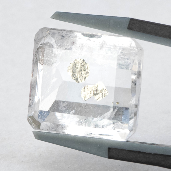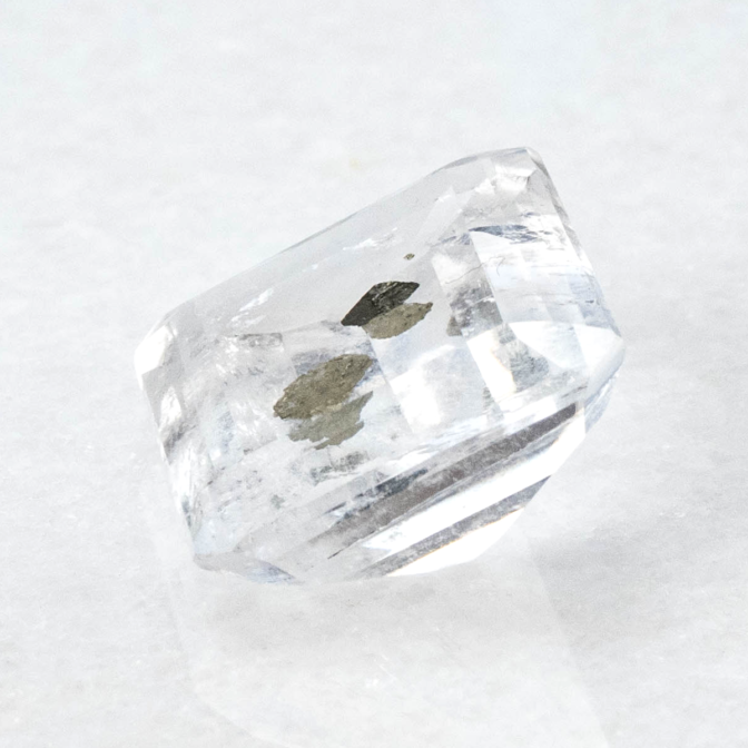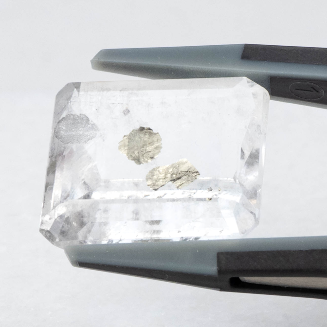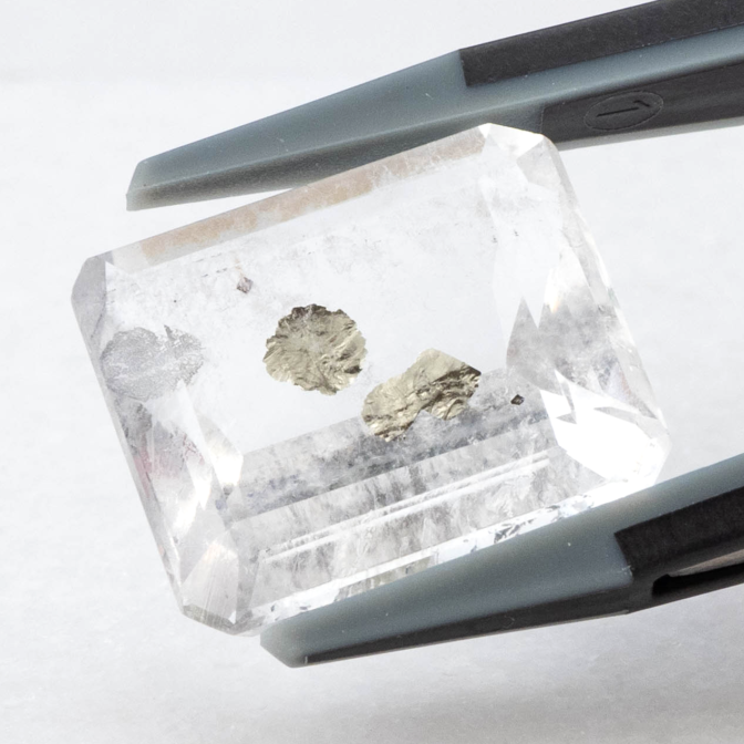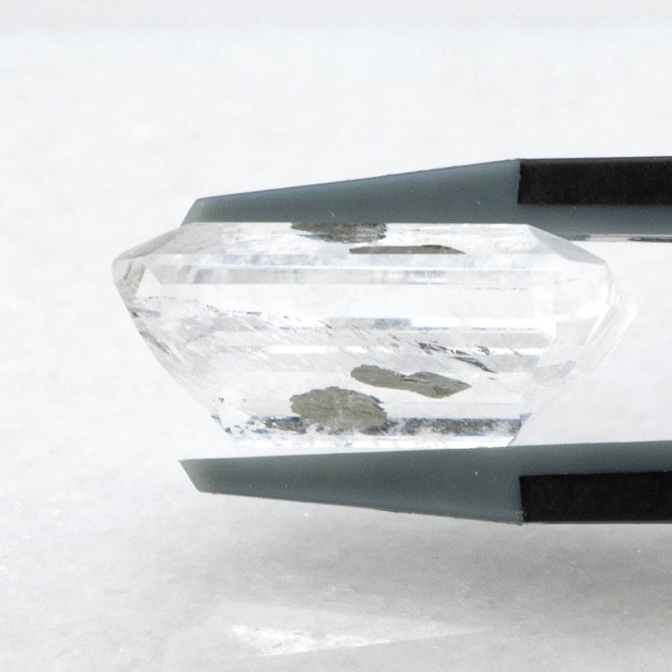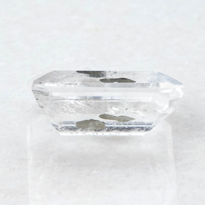 こちらのページで紹介しているルースは、エメラルドカットのクォーツの真ん中にパイライトの結晶が二つ入っています。真ん中が特に透明度が高く、端の方に行くにつれてシュワシュワとしたインクルージョンが入り始め、クォーツにちょっとした表情を加えています。よく見ると端の方の目立たないところにうっすらとパイライトの結晶が!観察すればするほど発見があるインクルージョンクォーツらしい楽しさに溢れています。