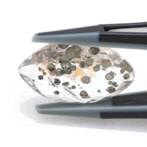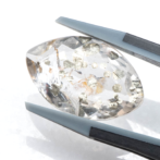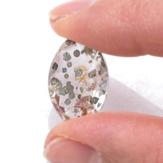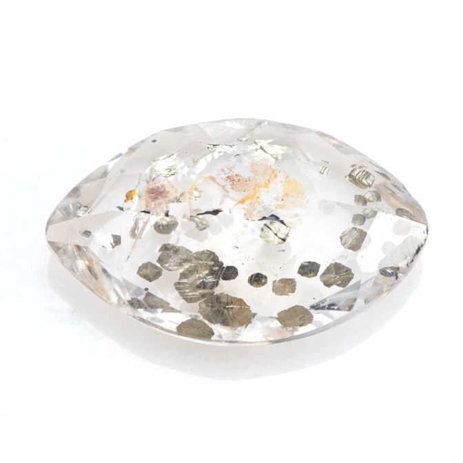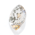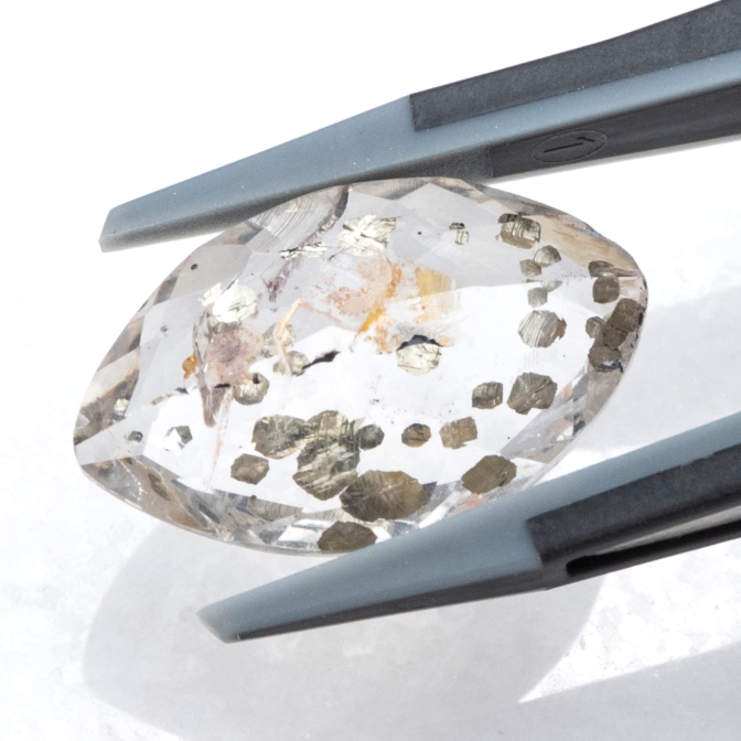 こちらのページで紹介しているルースは、マーキスファセットにカットされています。鋭角が多くカットがシャープなため、可愛いイメージのパイライトインクォーツにピリっとした辛口の味付け。ひやりとしたクォーツの質感と冷たい金属光沢を放つパイライトが、クールな魅力です。キラキラしすぎる事ないのに絶妙な華やかさがあり、モノトーンのスタイルにも合わせやすい潔い美しさ。あまり華美なルースを好まれない方にもおすすめです。