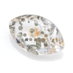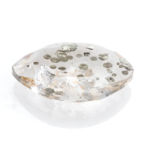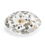 小さなパイライトの結晶がクォーツの中にたくさん集まり、賑やかにパーティーを開いているのでしょうか?透明なクォーツの中に、思い思いの位置に陣取ってキラキラと輝くパイライトは、ポルカドットのよう!眺めているだけで気分まで明るくなる楽しいルースです。粒状の結晶ではなく、薄膜状の結晶は水玉のように見えて、えも言われぬ愛らしさがあります。