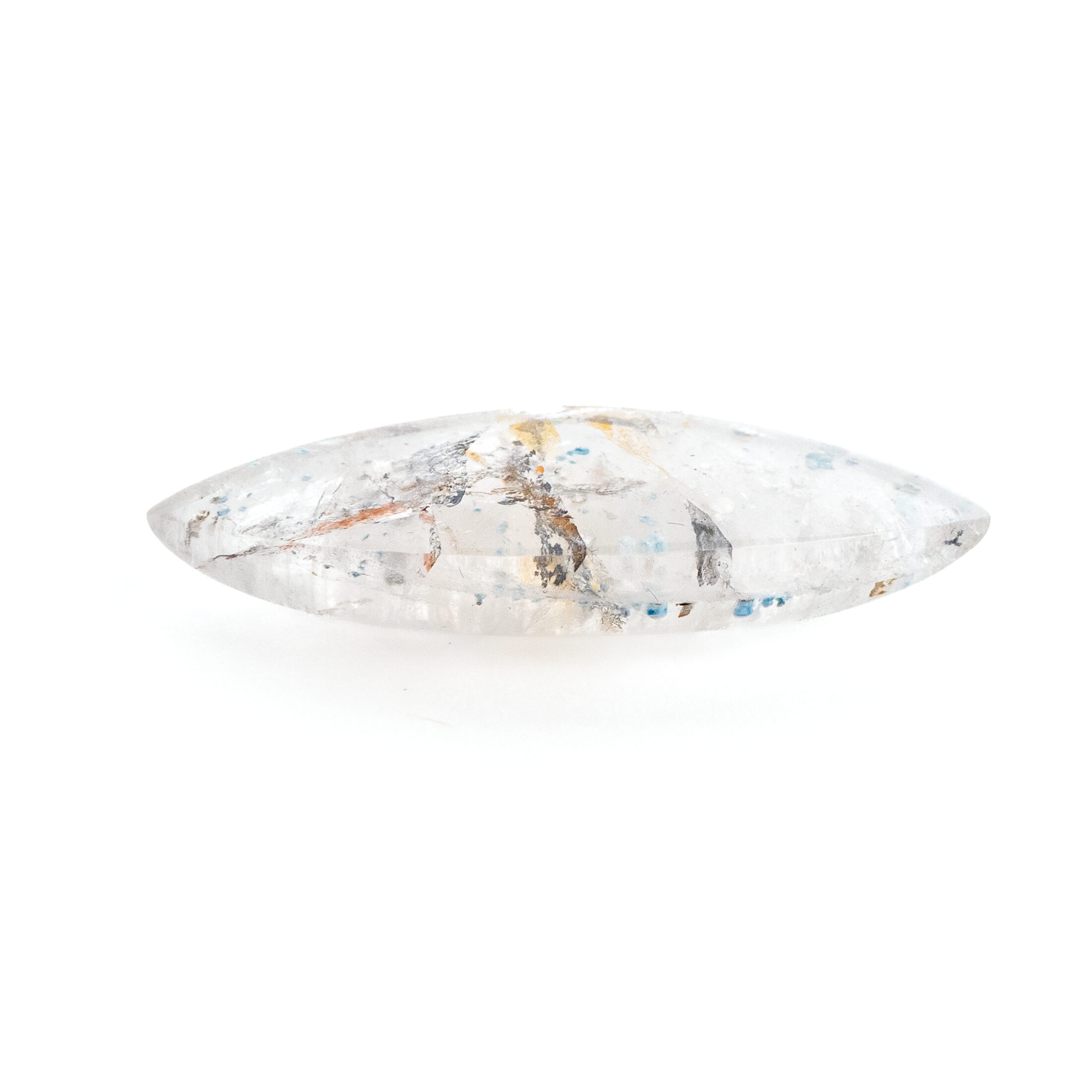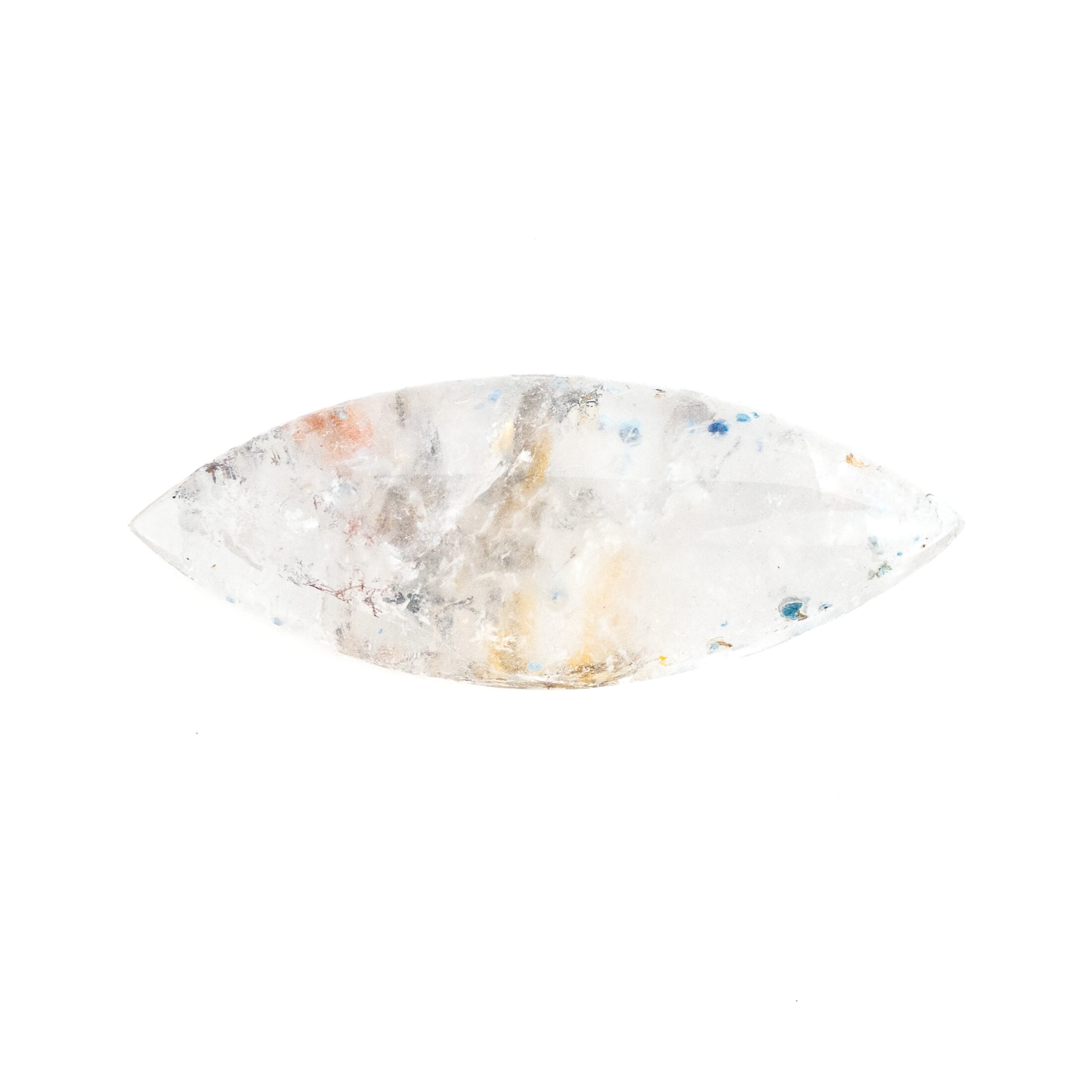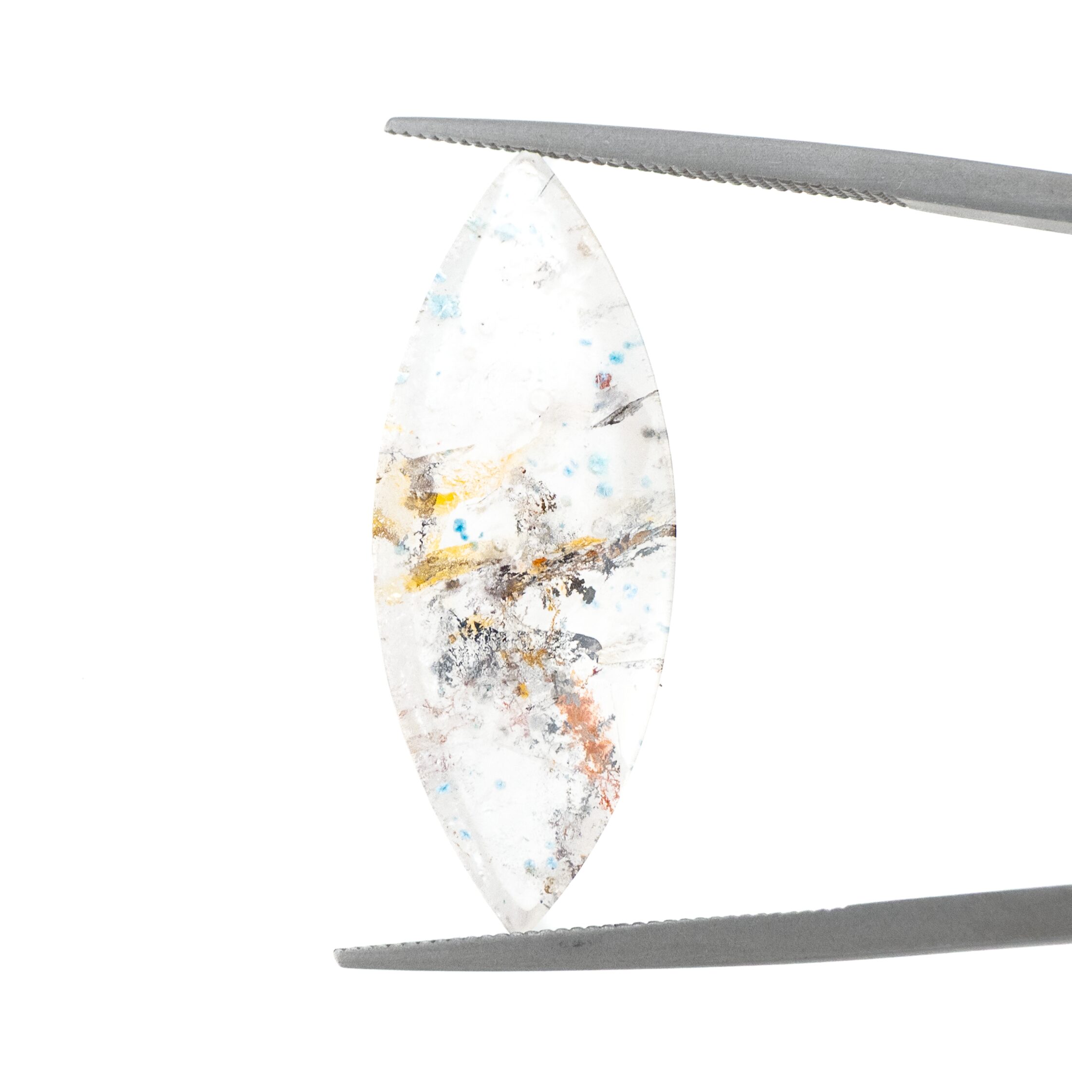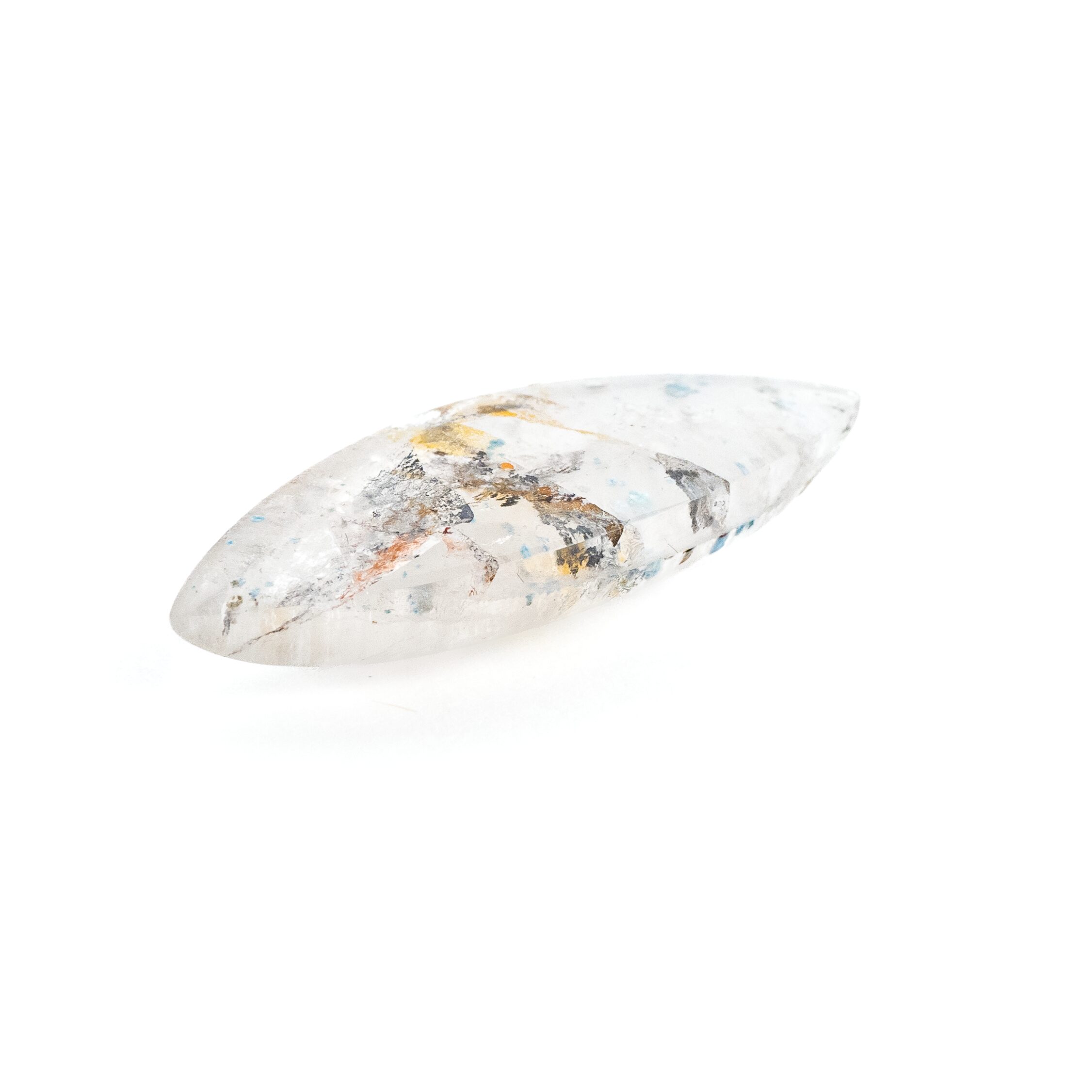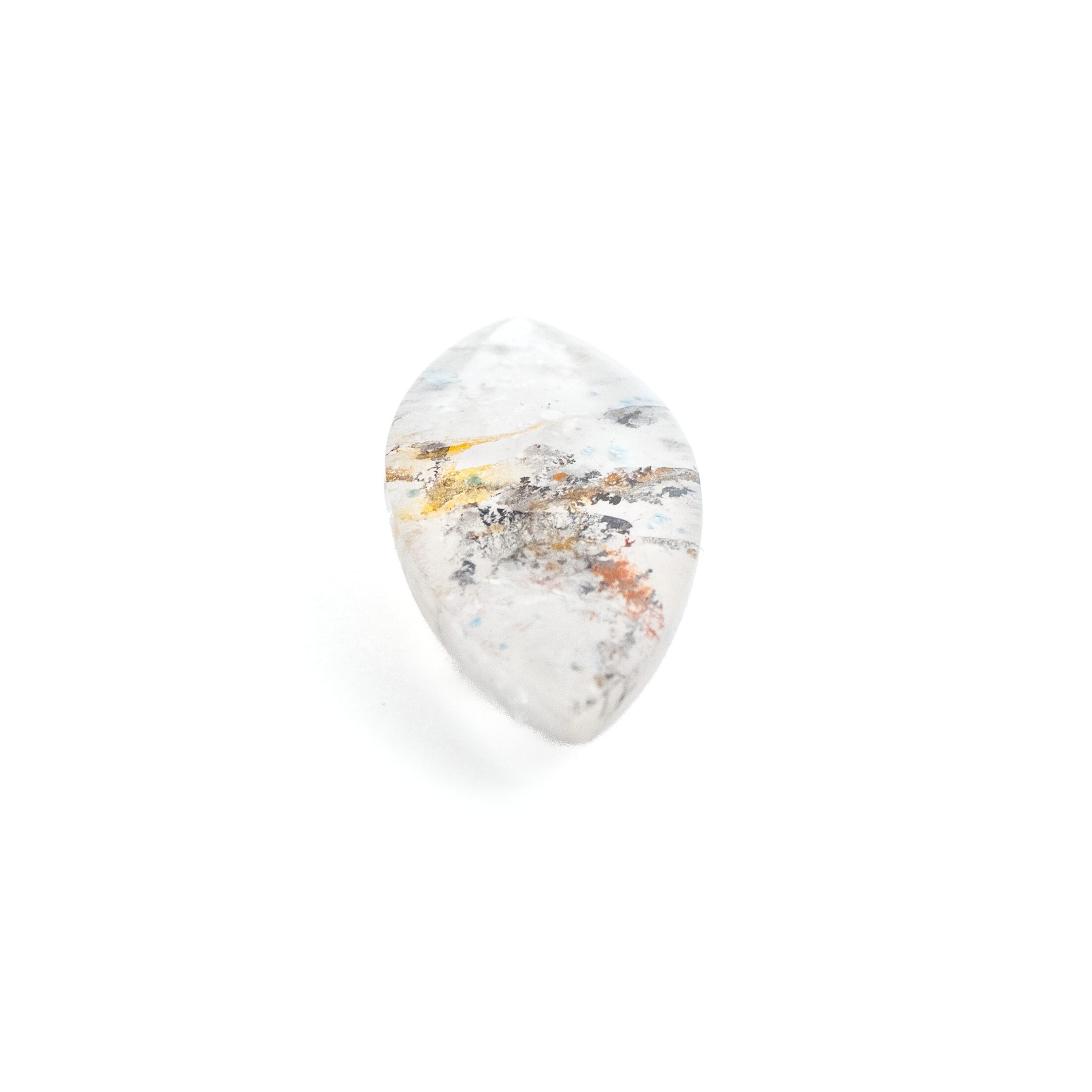 今回の香港買い付けで出会ったのは、ふっくらと厚みがあり、ころんと可愛らしいギラライトインクォーツたち。デンドリティッククォーツと共生しているもの、ダブルカボションで表裏なく使えるもの、端っこにリモナイトがいるものなど、バラエティ豊かで微笑ましくもあります。このページでご紹介しているルースも、表裏なく綺麗に研磨されており、どちらでもお使いいただけます。(ちなみにまるむ商会では、カボションが低い方ががお気に入りですので、「表」として扱っています。)
