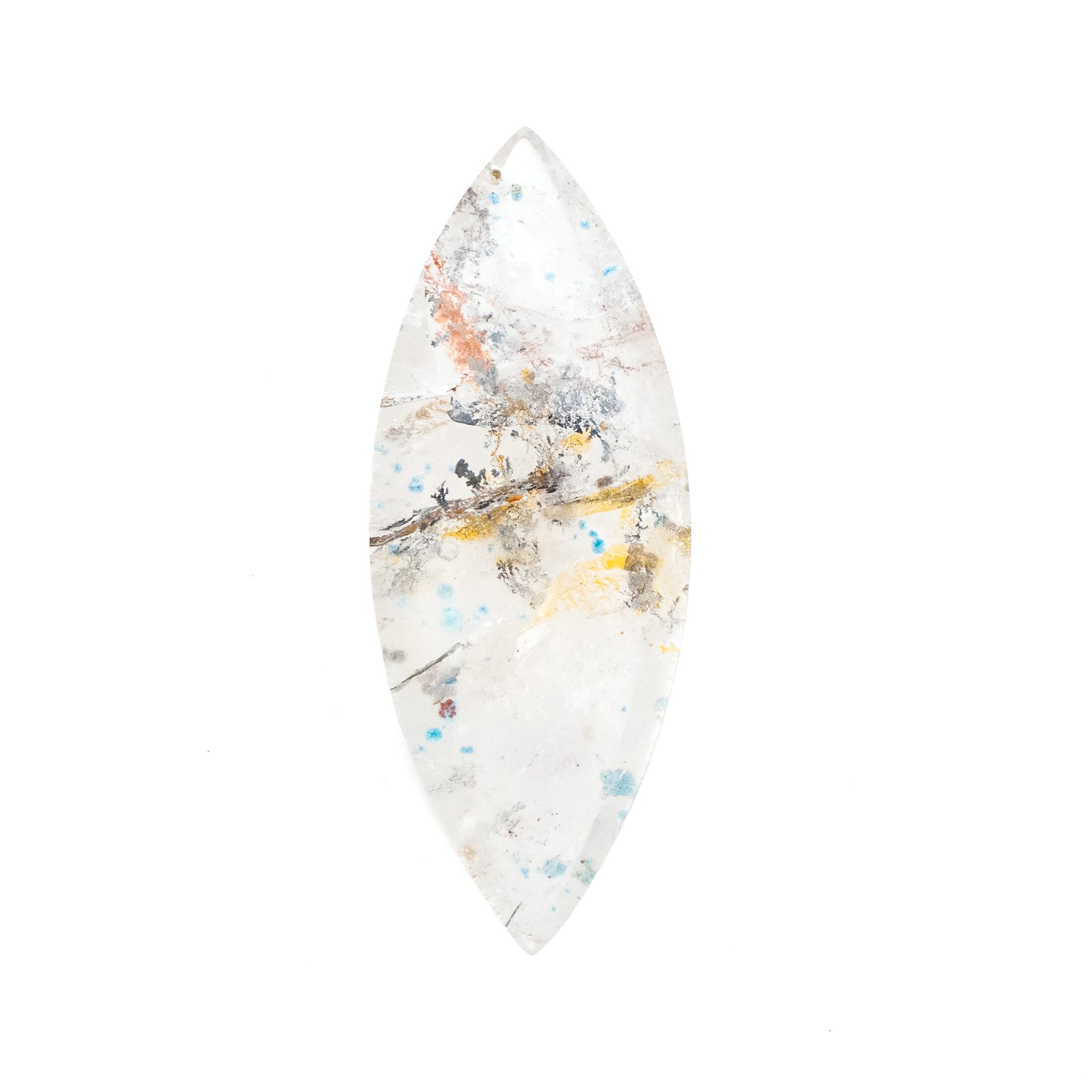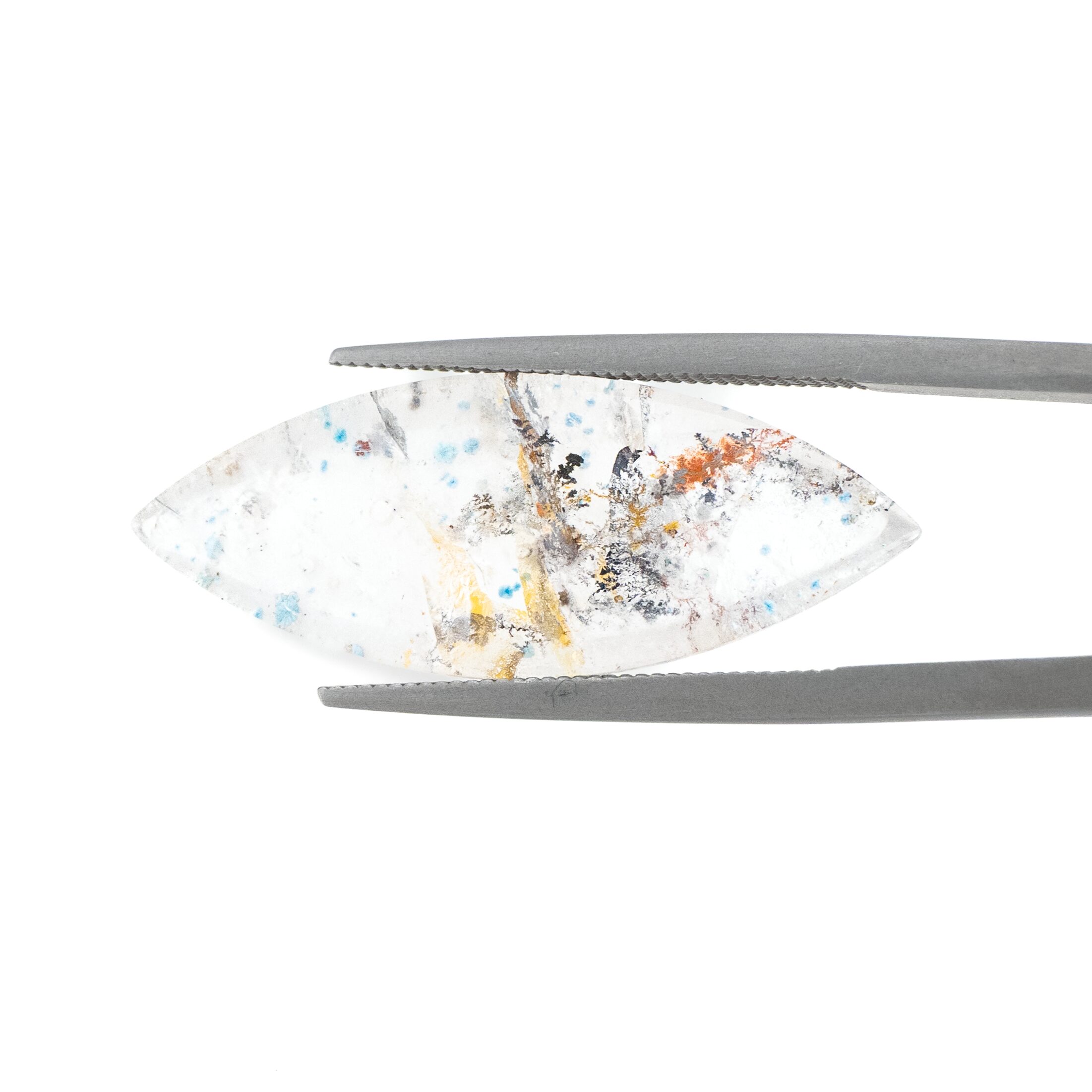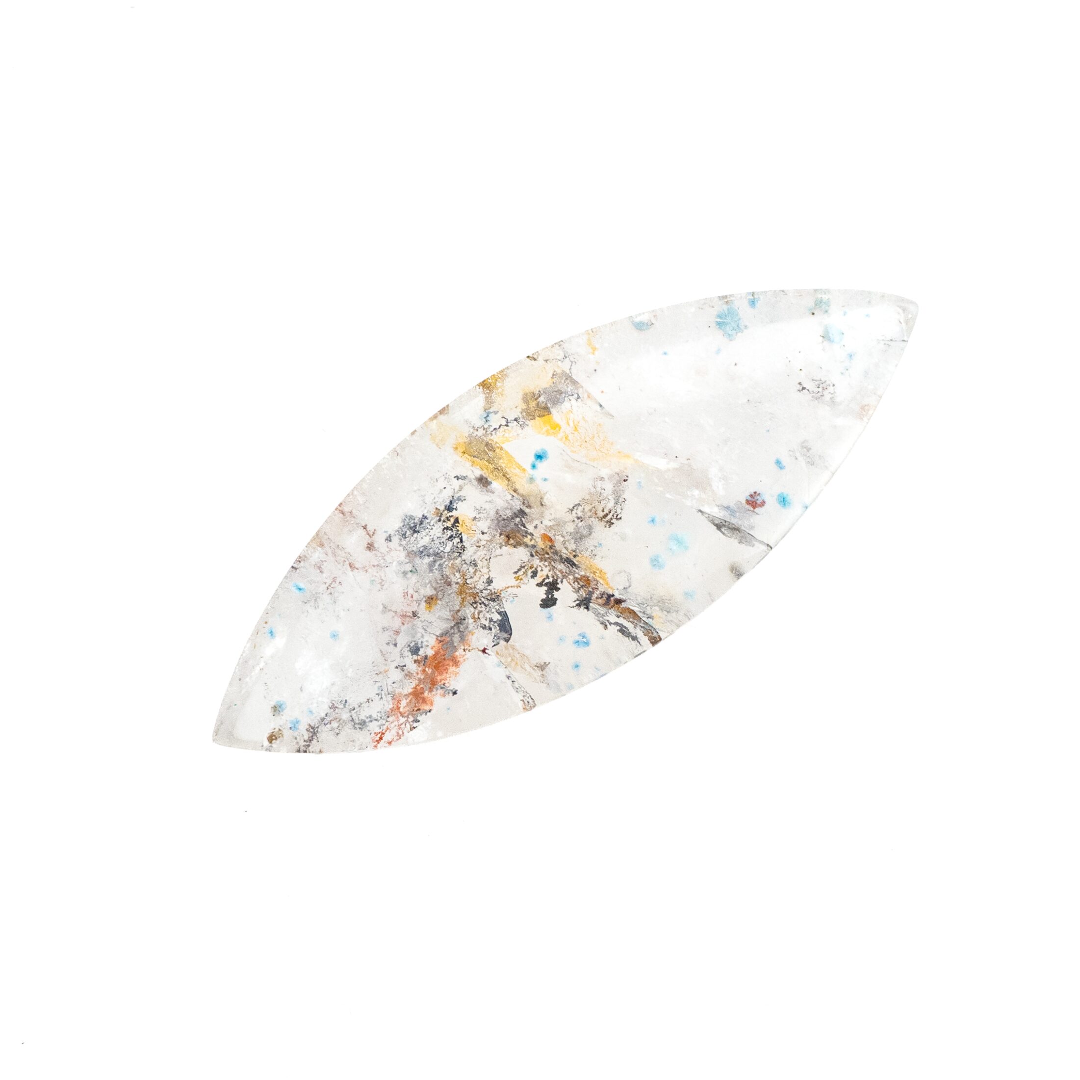まるでシュワシュワはじけるサイダーのよう。インクルージョンがキラキラと輝くクォーツの中に、鮮烈なパライバブルーのギラライトが泡のようにポップに踊ります。インクルージョン(不純物)がある石でありながらも透明感があり、ギラライトの存在感が際立つ逸品。日の光に透かすと白く輝くクォーツを背景に、可愛らしい水玉模様がフレッシュさを添える、希少なルースです。