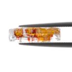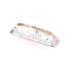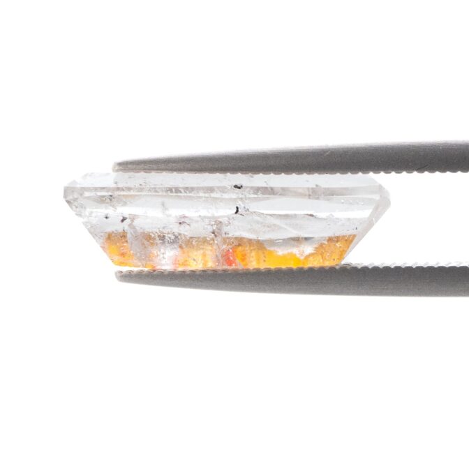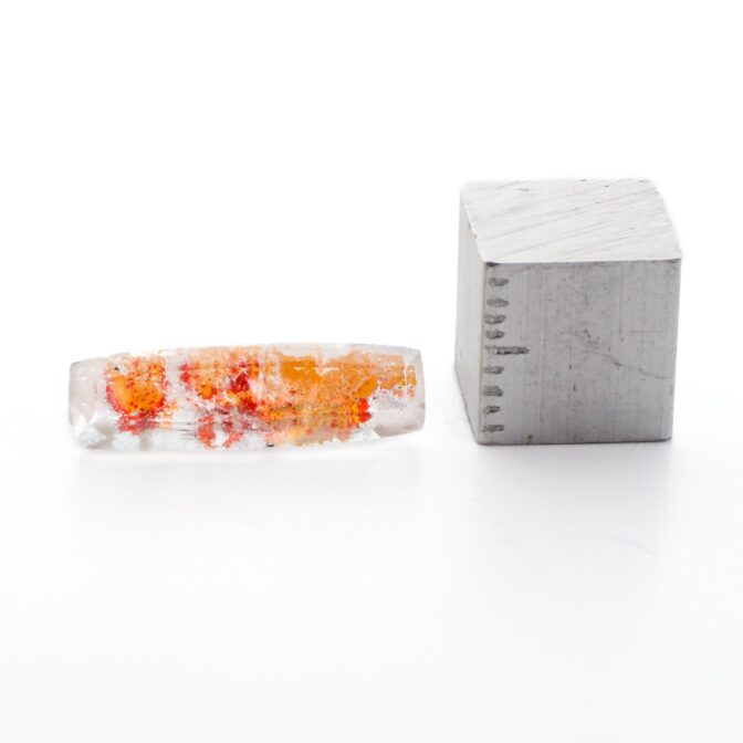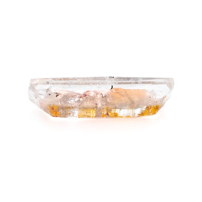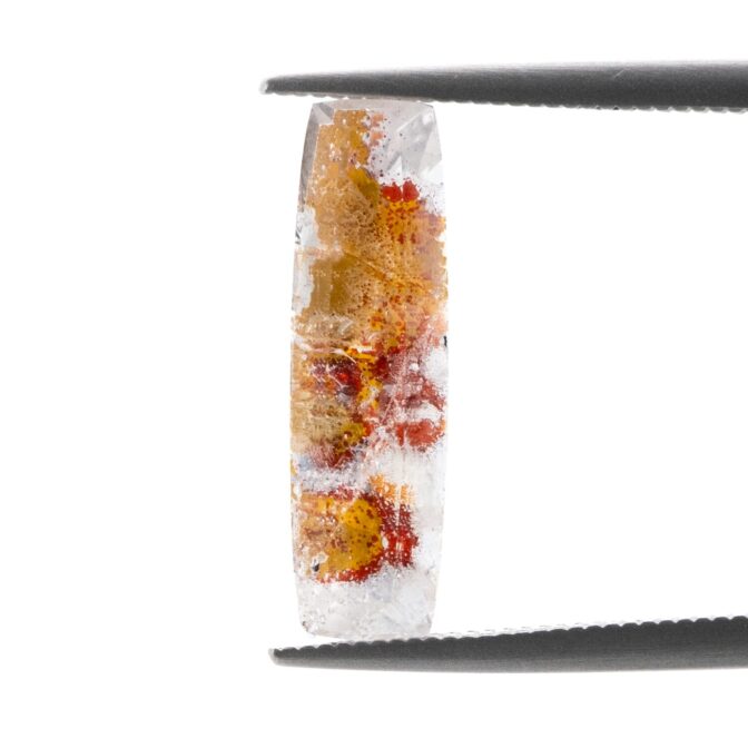 このページでご紹介しているルースは、ほっそりとしたファセッとカットがとてもおしゃれ。奥行き感があり、透明なクォーツの奥の方に見えるカラフルな色彩と繊細な輝きが、まるで万華鏡を覗き込んでいるような美しさです。シンプルを極めたシングルカットなのですが、華やかなリモナイトの良さを絶妙に引き立てています。完全な長方形ではなく、緩やかに弧を描く長辺のデザインもポイント。肩の力が抜けた柔らかい雰囲気をまといます。
