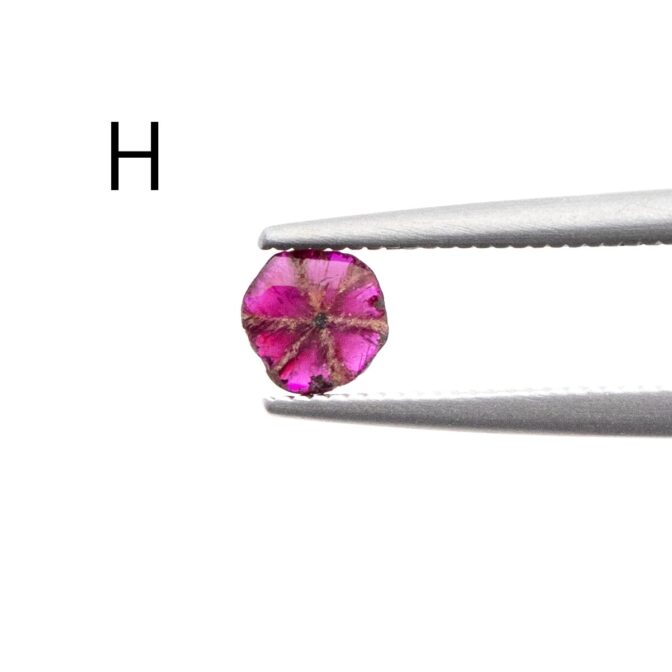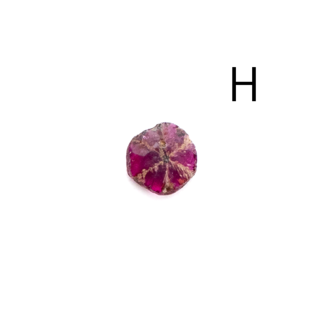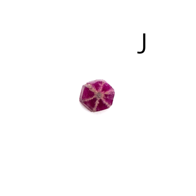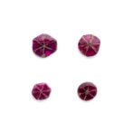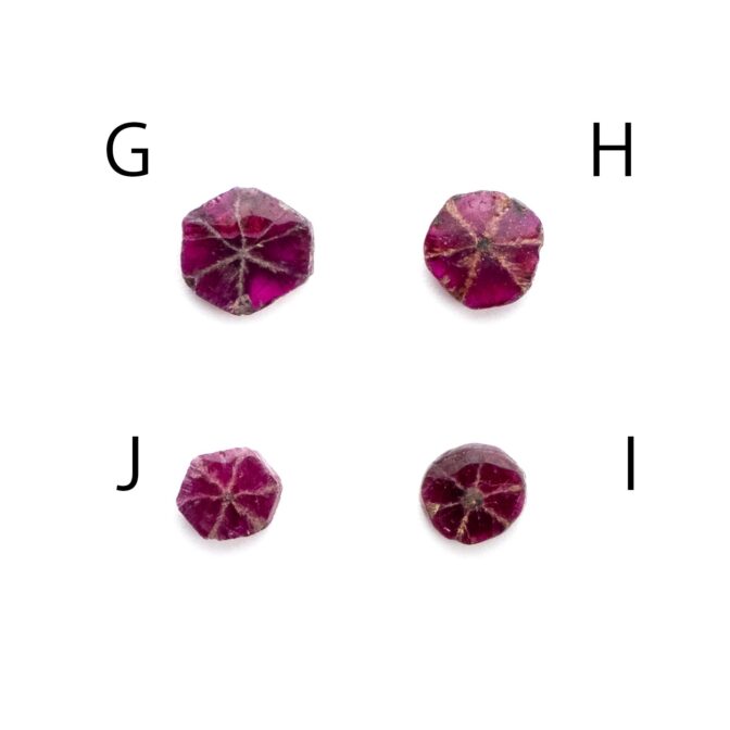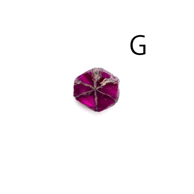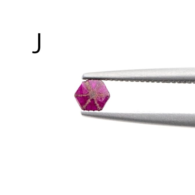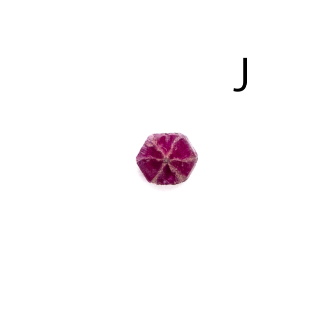 トラピッチェの模様はルビーの結晶が成長する時にインクルージョンが入り込んで出来たもの。従ってルースにしたときにインクルージョンが多く、あまり透明度と色が良くない場合が多いのです。ところが、こちらのページでご紹介しているトラピッチェルビーは後ろ側が透けるほど透明度が高く、つやりと磨かれ6条の線もはっきり見える極上品。原石の味を生かしながら整えられた形もかわいらしく、個性的な模様と相まっていくら眺めていても飽きることはありません。