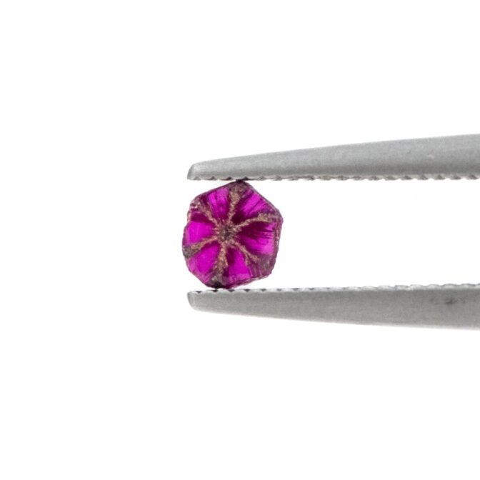 トラピチェルビーの素晴らしく美しくあでやかな赤色の中にほんのり見えるのは、六条の放射状のラインです。これは、ルビーの結晶が成長する時にインクルージョンが入り込んで出来たもの。結晶が成長する形に沿って不純物が入るため、見事に六角形の対角線状に線が入ります。これが、トラピッチェ(歯車)の様に見えるので、トラピッチェルビーと呼ばれる所以。まるで、真紅のルビーを飾る幾何学的な模様のように見えて、とても魅力的なのです。