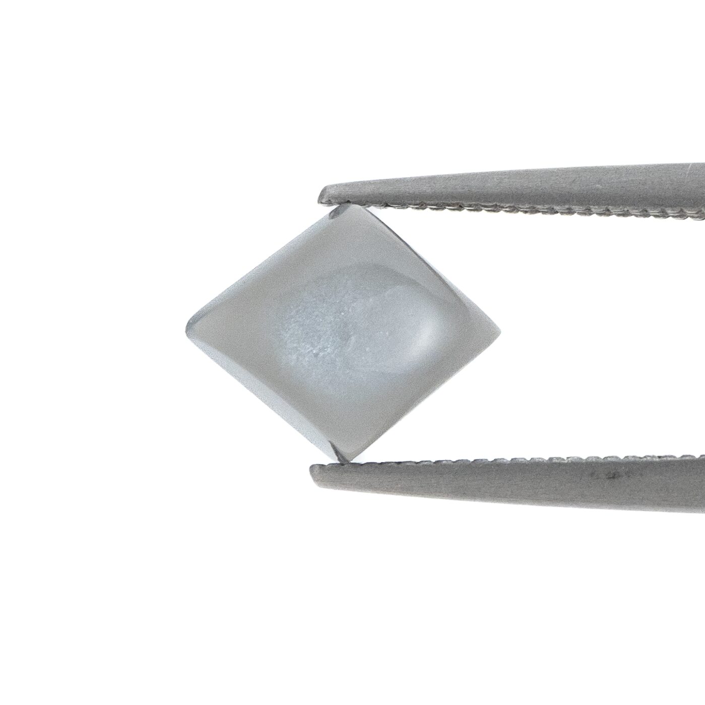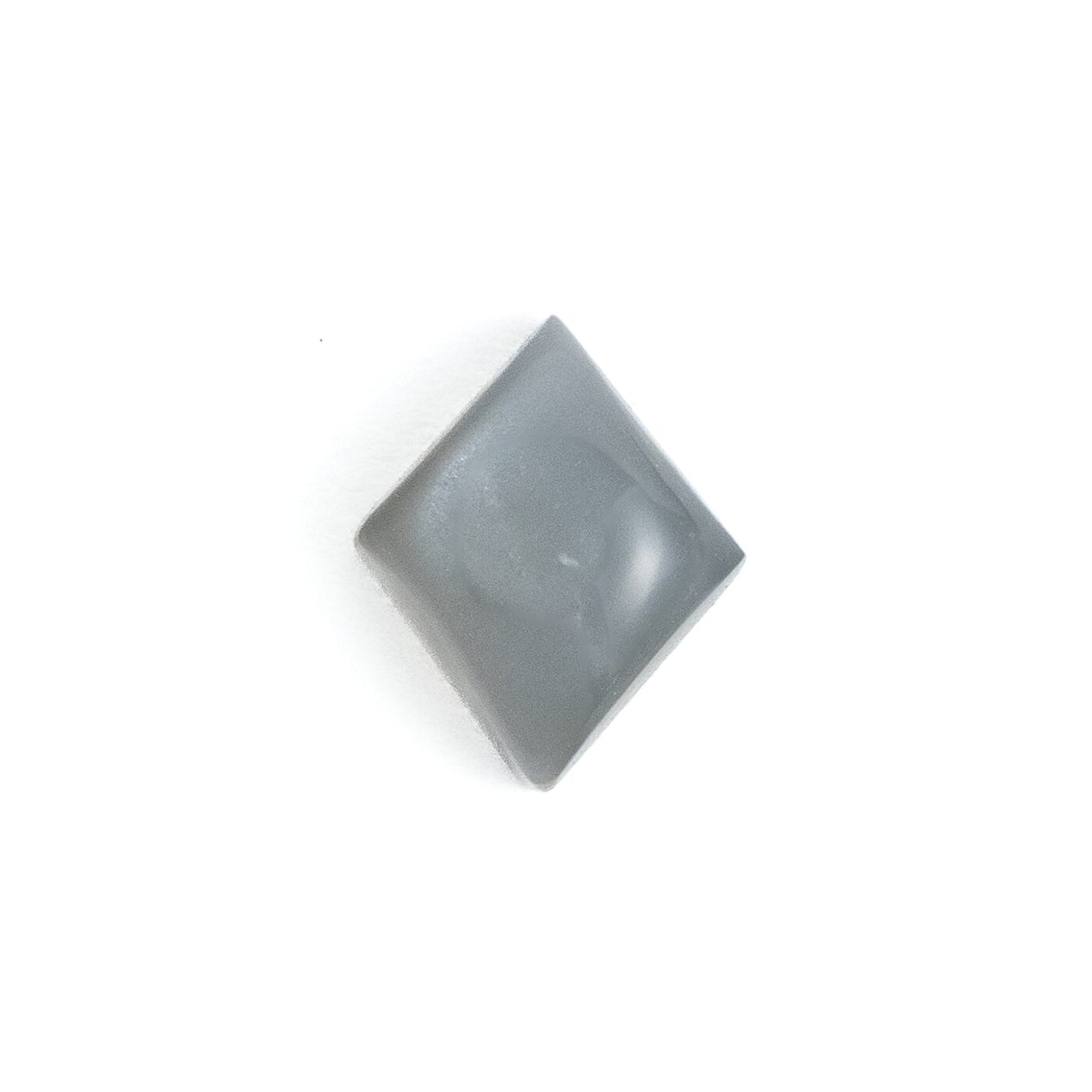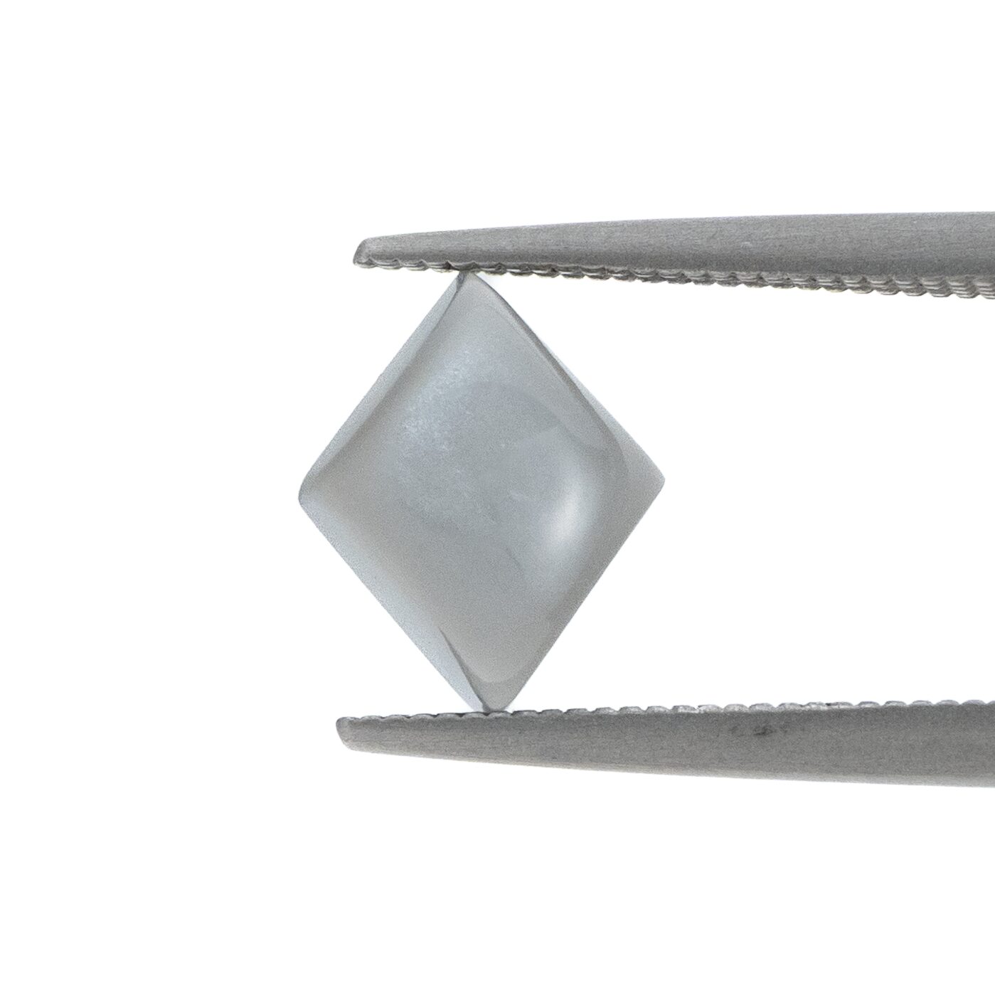 さて、このページでご紹介しているムーンストーンの何がすごいかというと、まずその色味。こんなに強く濃く、そして美しいグレイカラーのムーンストーンは見たことがないというほど。まるで水を含んだかのように艶めく表層に、奥の方からギラリと白い光が湧き上がりながら輝きます。白く輝くグレイがこんなに美しい色だったなんて、この石に出会ってから初めて知りました。そして、形の可愛らしさも他にはない魅力。ムーンストーンはオーバルやカボションに磨かれることが多い中、あえて菱形のカボションにしているところがとても個性的です。スタイリッシュかつクールな印象のグレイに、ほんのひと匙、甘さを添えた絶妙な丸みを持った形です。