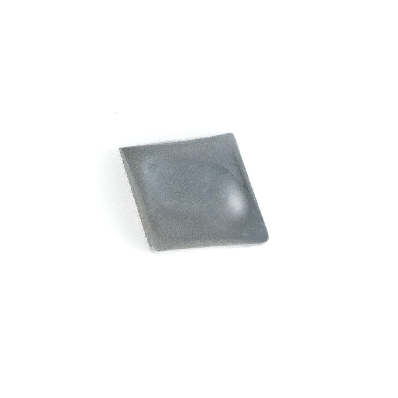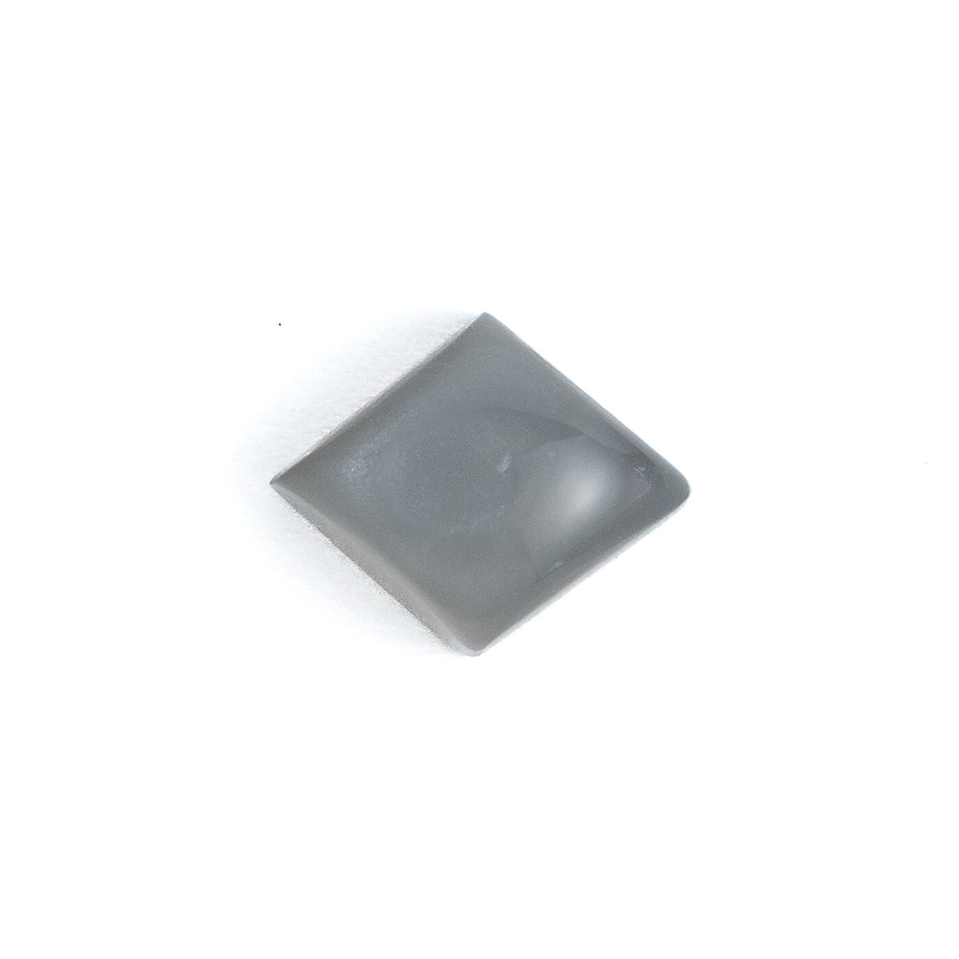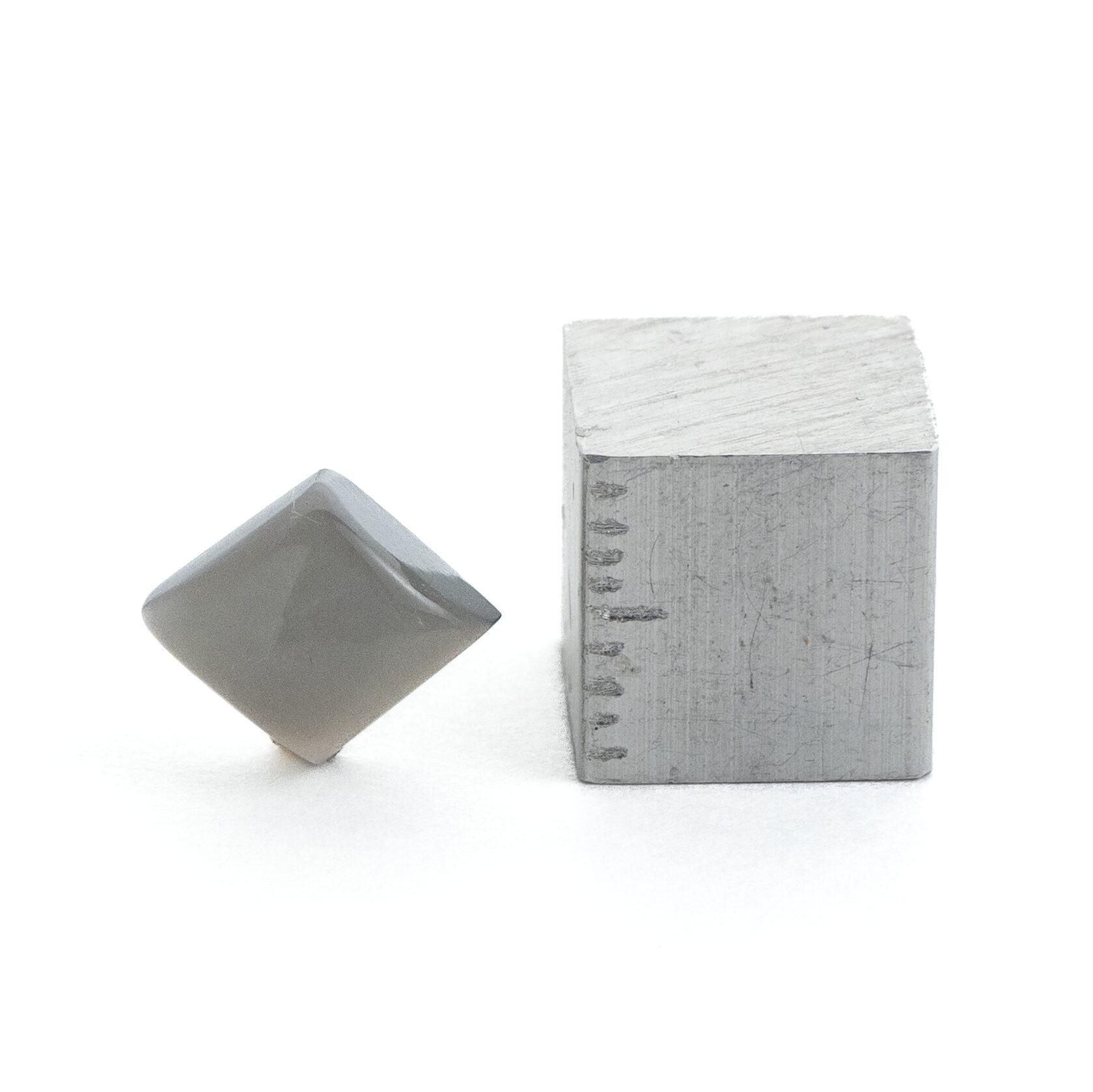 さて、このページでご紹介しているムーンストーンの何がすごいかというと、まずその色味。こんなに強く濃く、そして美しいグレイカラーのムーンストーンは見たことがないというほど。まるで水を含んだかのように艶めく表層に、奥の方からギラリと白い光が湧き上がりながら輝きます。白く輝くグレイがこんなに美しい色だったなんて、この石に出会ってから初めて知りました。そして、形の可愛らしさも他にはない魅力。ムーンストーンはオーバルやカボションに磨かれることが多い中、あえて菱形のカボションにしているところがとても個性的です。スタイリッシュかつクールな印象のグレイに、ほんのひと匙、甘さを添えた絶妙な丸みを持った形です。