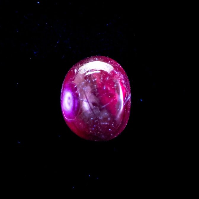 そんな私の表情を読んだ研磨士さんが、得意気にUVライトを取り出し、パッと照らしたらびっくり!なんと、美しく明るい赤色に蛍光するのです。「これ、珍しいの!サファイアなのに、まるでルビーのように蛍光するのよ!」