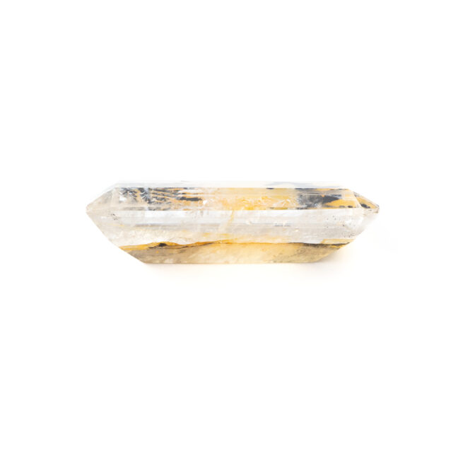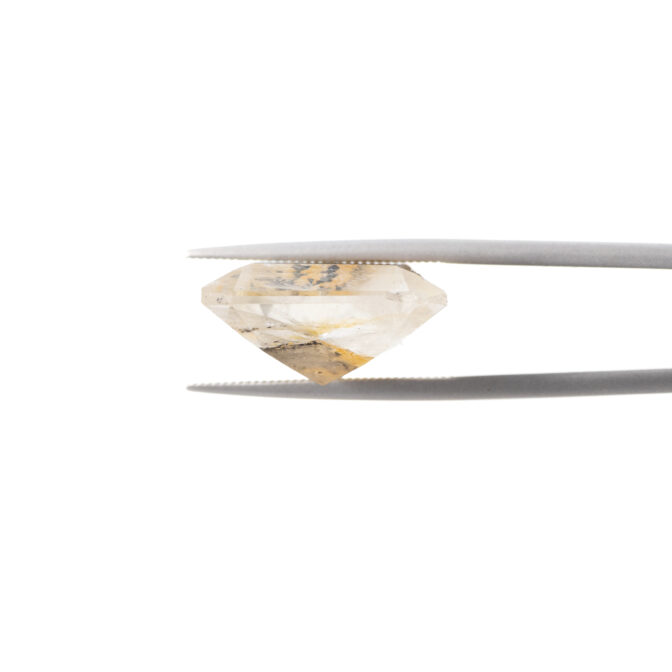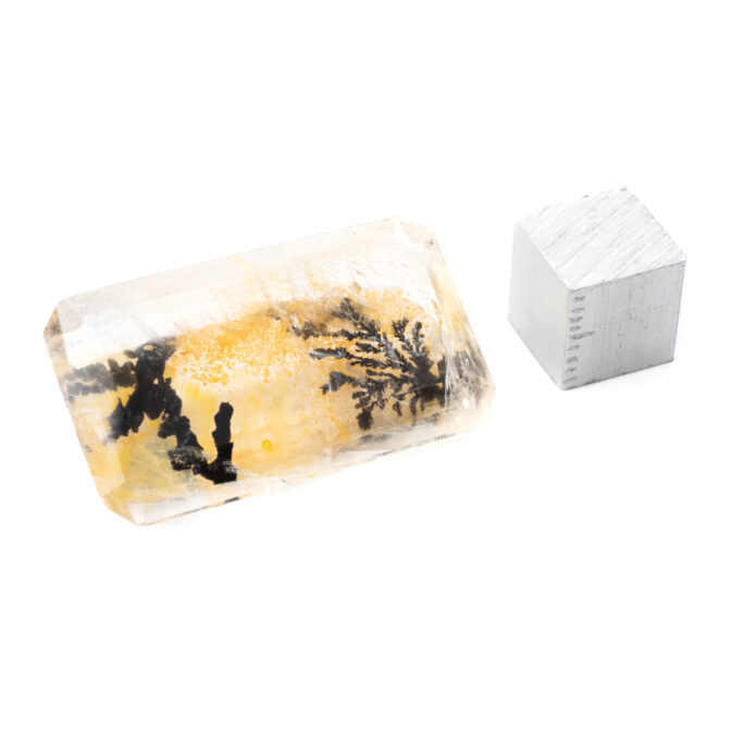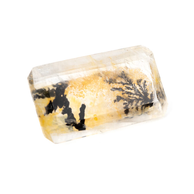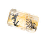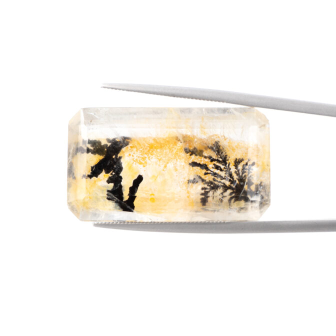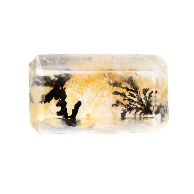 このページでご紹介しているデンドリティッククォーツもそのうちの一つ。エメラルドカットに研磨された透明なクォーツの底に、漆黒の大きなインクルージョンが二つゆらめいています。一つはとても繊細で、野に咲く草花を連想させる美しさ。もう一つは力強くワイルドで、砂漠に生える巨大なサボテンのようにも見えます。その後ろに流れるようにたゆたう優しいイエローブラウンの背景が、二つの模様をよりドラマティックに引き立てます。