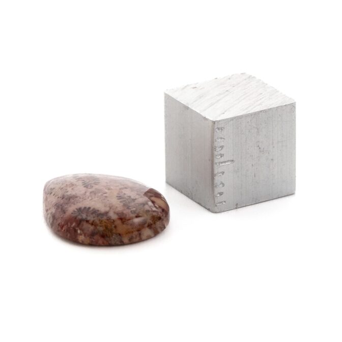 模様のある石は、大きいほうが見栄えがするもの。事実、「菊目石」として流通しているものの中には、オブジェや置物にとして楽しめるよう、巨大な塊にしたものが存在します。ルースとして削り出された場合、比較的大きめに研磨され、存在感ある素敵なマクラメアクセサリーになっていたりもします。マクラメのナチュラルな風合いと、フォッシルコーラルのアースカラーの相性は抜群に良いのですが、そこでふと考えたのです。金色や銀色に輝く地金と合わせて、彫金でジュエリーにしたら斬新な見た目になるのではないか?と。