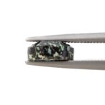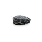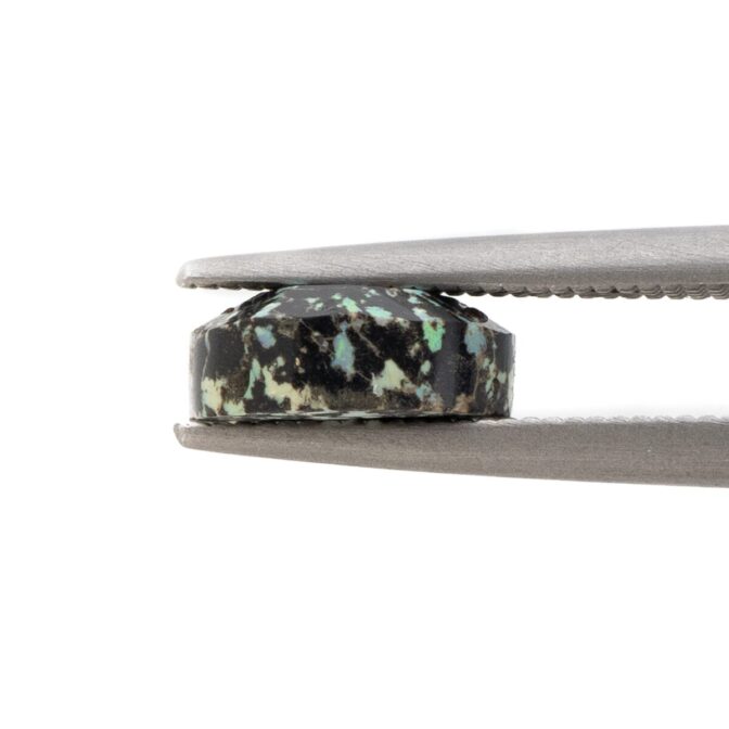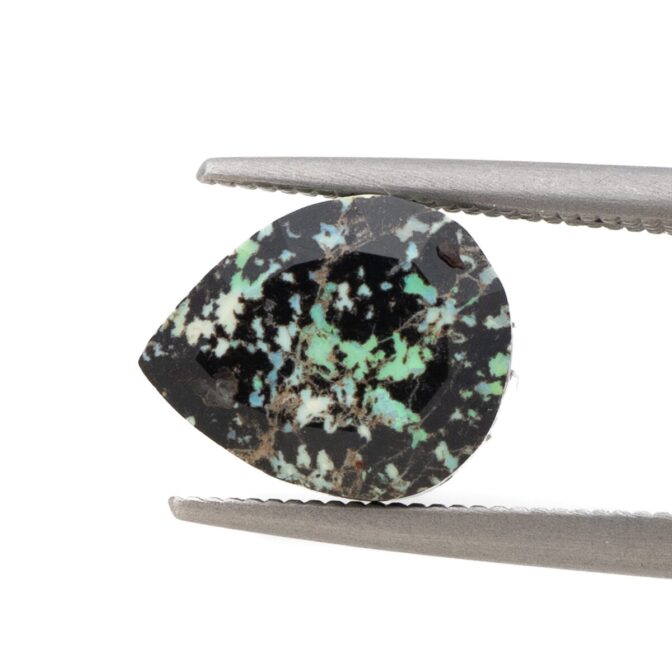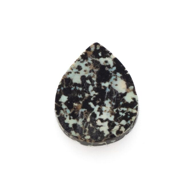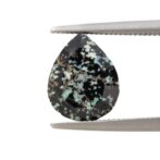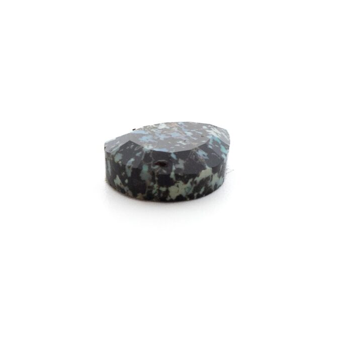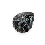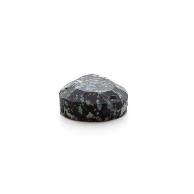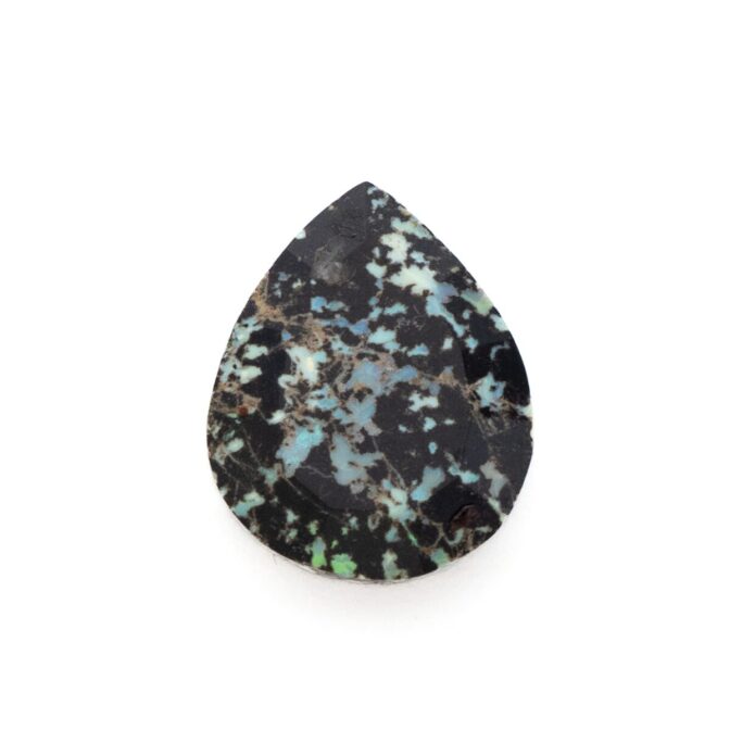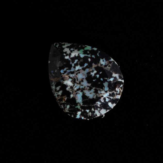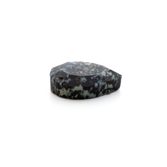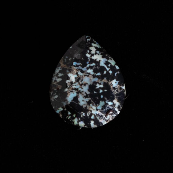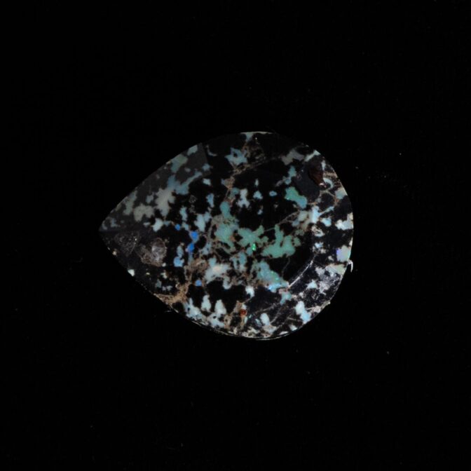 このページでご紹介しているレオパードオパールは、なかなかにチャレンジングなカットが施され、一際輝く個性を発揮しています。ティアドロップに一段階のみファセット面をつけ、シンプルかつ上品に仕上がっています。オパール系の石は、オーバルカボションが多いのですが、研磨した人のセンスなのでしょう。個性的なカットと個性的な石の組み合わせが驚くほどしっくり馴染み、尖りすぎず普通すぎずのちょうど良いデザインに仕上げられています。一見モノトーンのシックな色合いですが、光にかざすとところどころに散りばめられた遊色が燦然ときらめき、華やかに輝き出します。その色とりどりの美しさは地上の宝石とも言われる夜景のようにも見えます。レオパードの名の通り、ワイルドな美しさを持ちつつ品の良いオーラを漂わせ、大人が持つにふさわしい上質さを兼ね備えます。