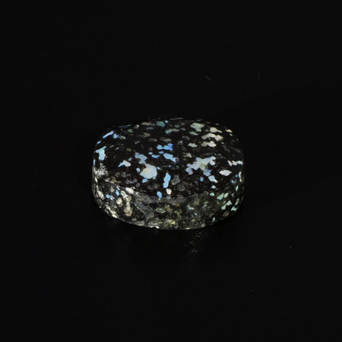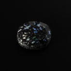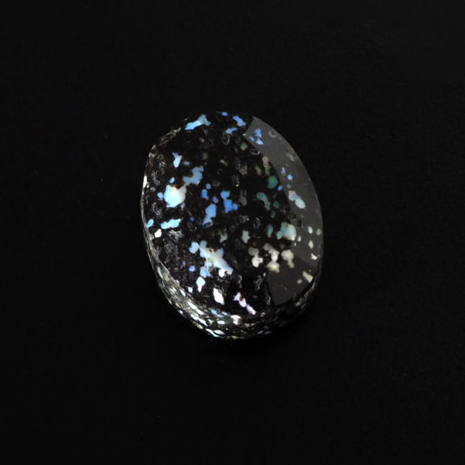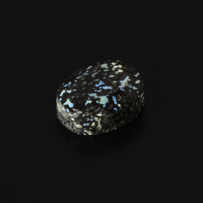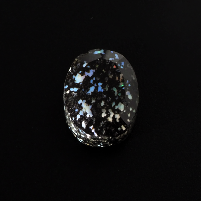 このページでご紹介しているレオパードオパールは、オーバルシェイプに端正なファセットカットが施され上品な表情。玄武岩のブラックの分量が多く、ちらちらと細かい遊色が出るオパールが全体にまんべんなく散りばめられ、ちょっとクールな印象です。一見ブルーとグリーンの遊色が多いようですが、石の角度を変えると鮮やかなレッドの遊色が飛び出してくるのがとても魅力的!