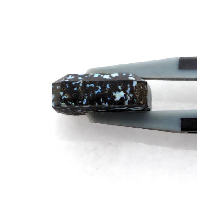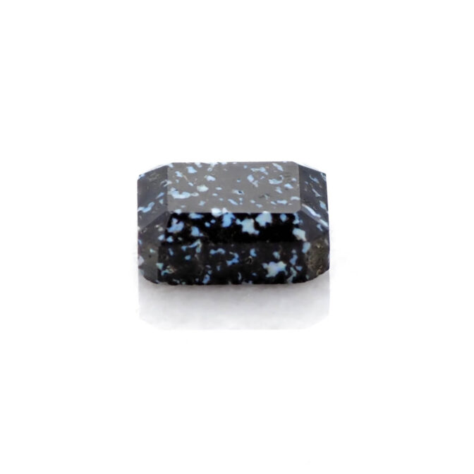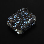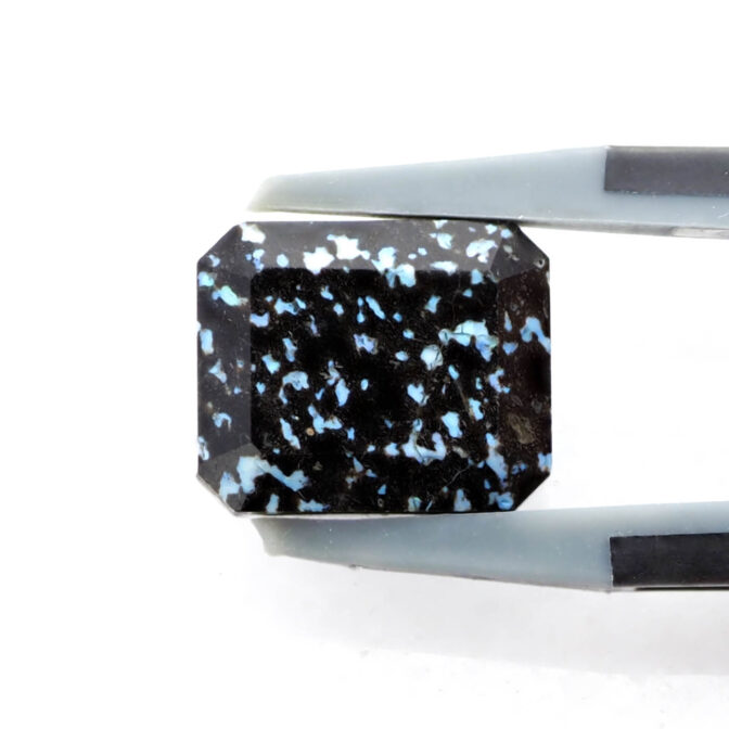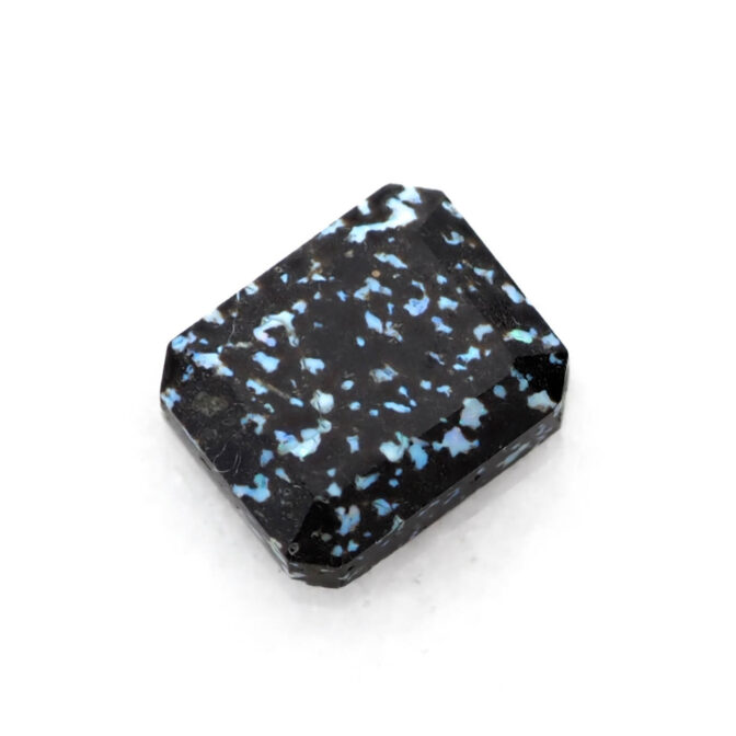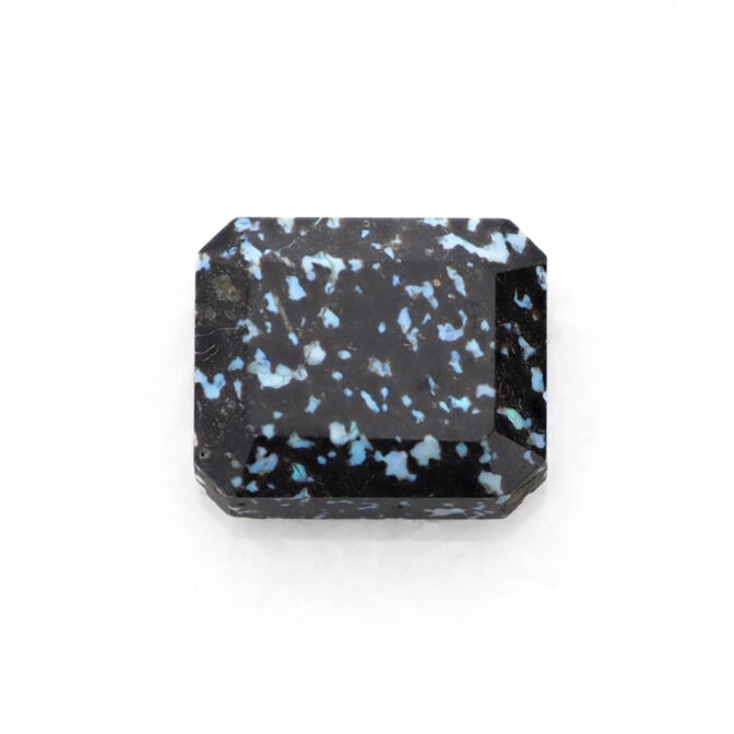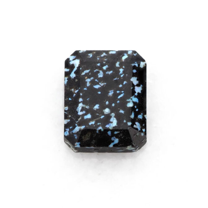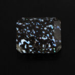 このページでご紹介しているレオパードオパールは、端正なエメラルドカットに仕立てられています。深いブラックの玄武岩の中に散りばめられたブルー系の遊色が地上の宝石、夜景のようにも見えます。個性的なレオパードオパールの中でも、バランスの良い配色と整ったプロポーションがくせを感じさせず、さらりと身につけられそうな佇まい。それでいて唯一無二と言って良いほどの洗練されたスタイルは、希少なオパールならでは。さらにここまで美しいファセットカットが施されているものはほとんど見かけることはありません。強く美しいきらめきを放つ極上のルースです。