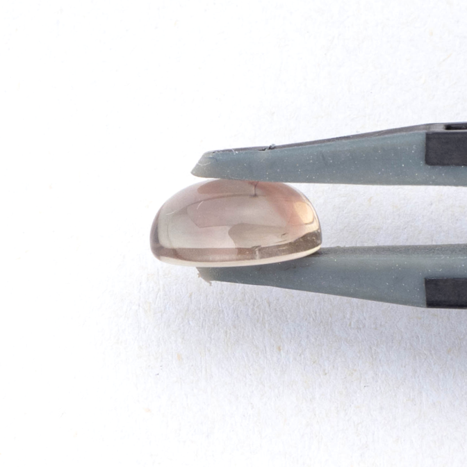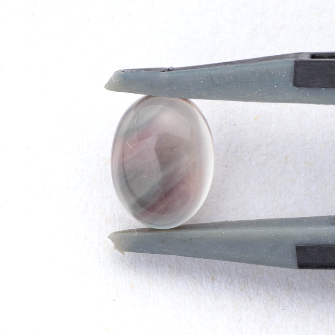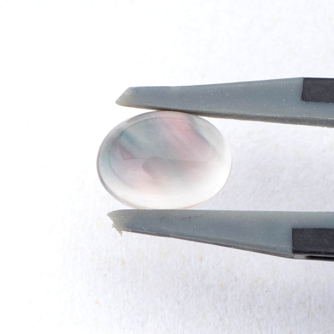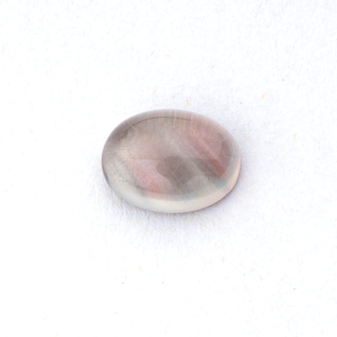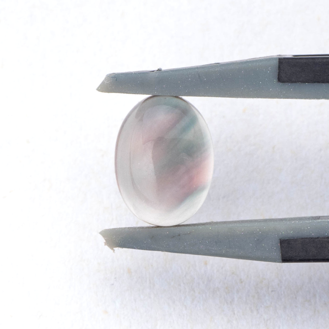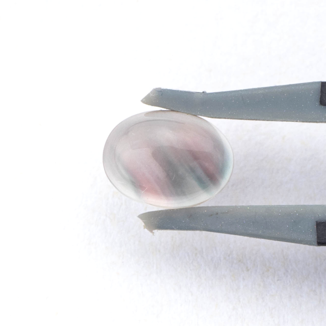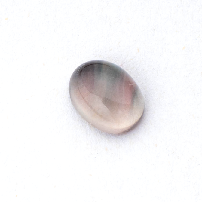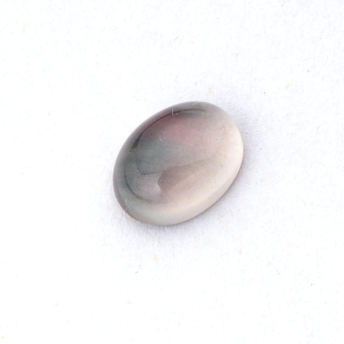 透明感あふれ、光を柔らかく取り込むカボションカットはそれだけでも美しいのに、透明なドームの淡い色彩はまるで水彩で描かれた絵画のよう。よくみるとふんわりとしたオレンジとグリーンのバイカラーになっており、それぞれの色が繊細に絡み合い、潤んだような輝きのルースを彩ります。まるで絵筆に虹を乗せてさっと筆を走らせたようなふしぎな模様はとてもファンタスティック。真上から見た時に最も色と模様が濃く見えるので、リングへのお仕立てがおすすめです。