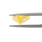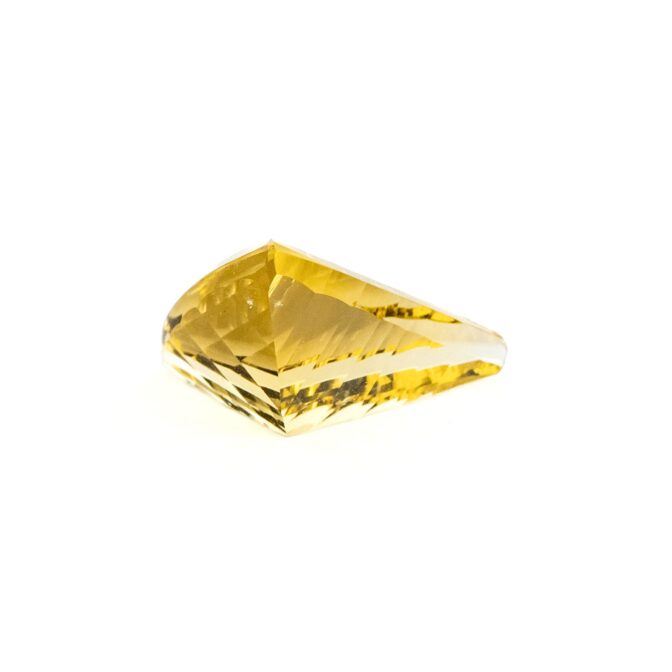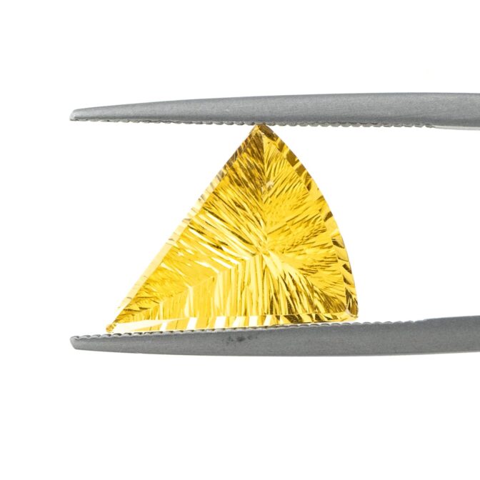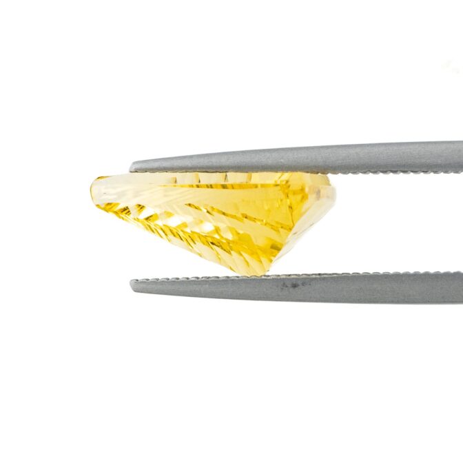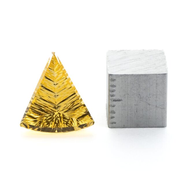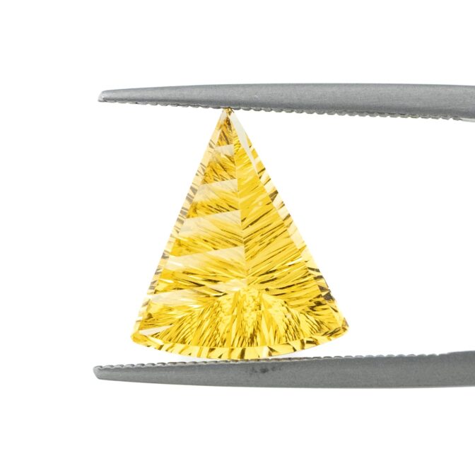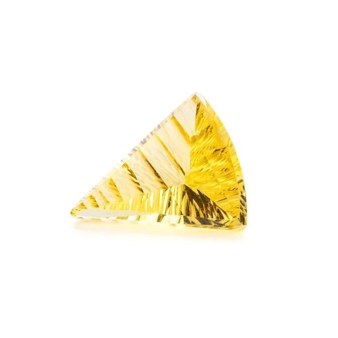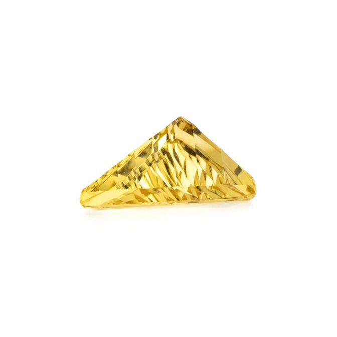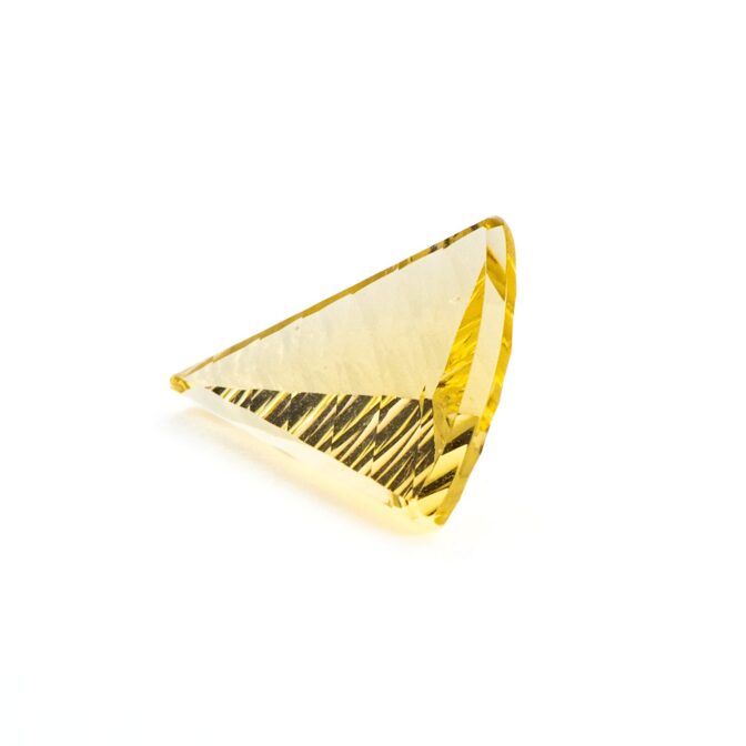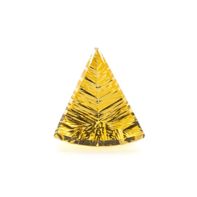洗練された細長い三角形は、ストイックな緊張感を持ち、可愛いというよりはハンサムな印象。3つの面全てが精緻にカットされ、折り重なるように隙間なく敷き詰められた浅めコンケーブカットが、軽やかな光のリズムを生み出します。角度によって弾むように輝く黄金の色彩は、宝石研磨の真髄と呼ぶにふさわしい風格です。