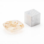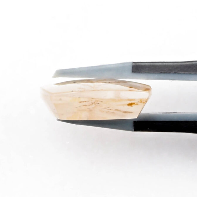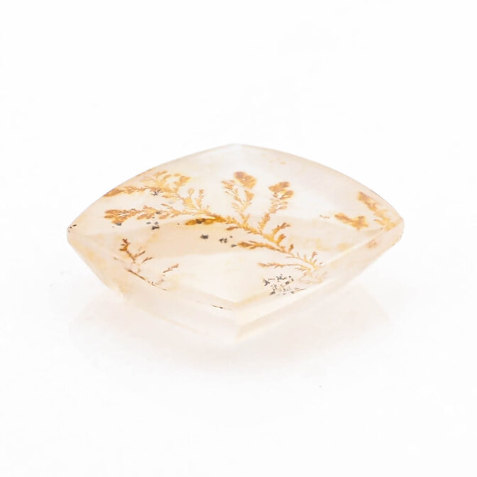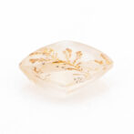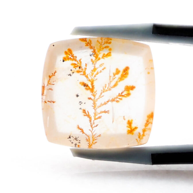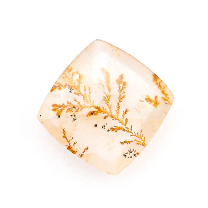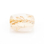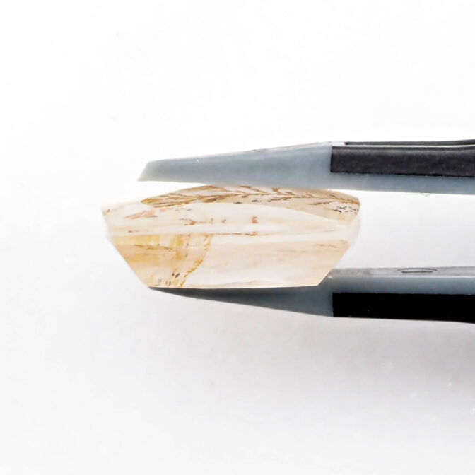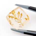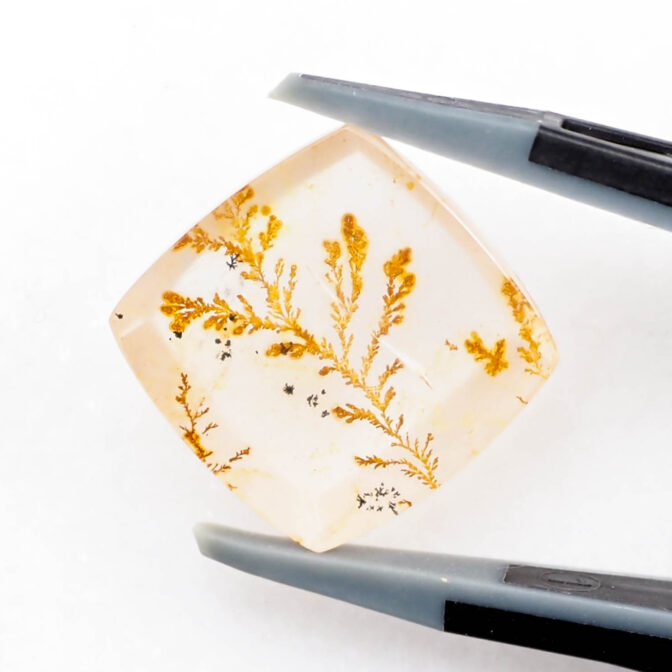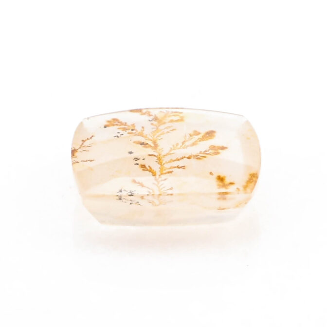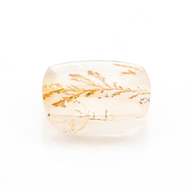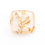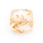その柔らかにゆらめくインクルージョンの様子から、軟質の珊瑚が海流になびいているかのように見えます。人によっては全く違う景色に見えるかもしれません。ハーバリウムをそのまま石にしてみました、と言われても信じてしまいそう。こんな不思議な光景を宿す石が、きちんと角がある長方形にカットされると、品よく額縁に収まっているようでより味わいが深まります。