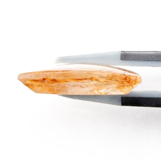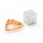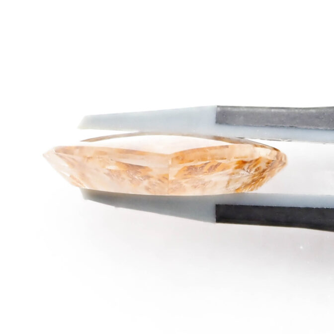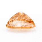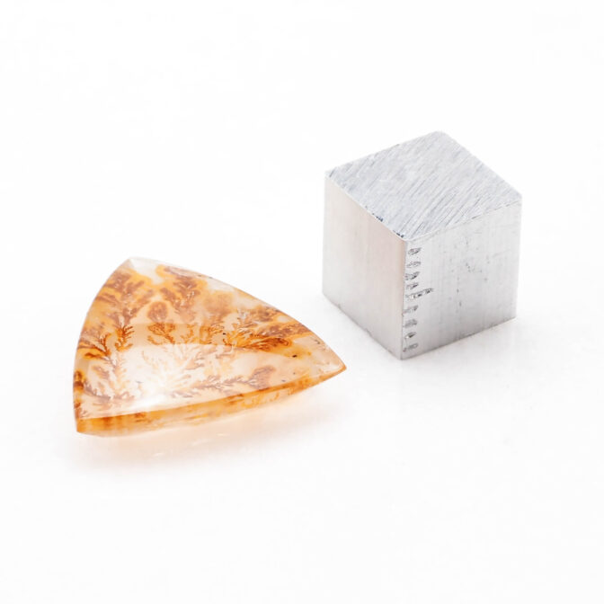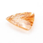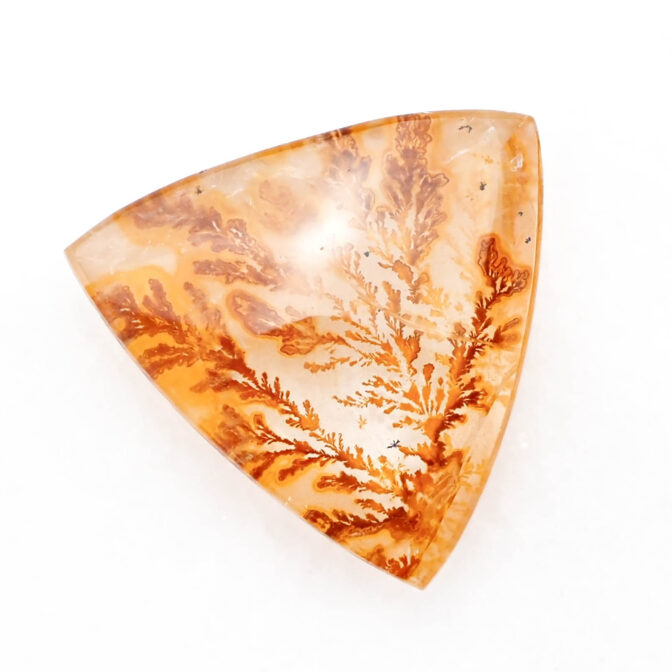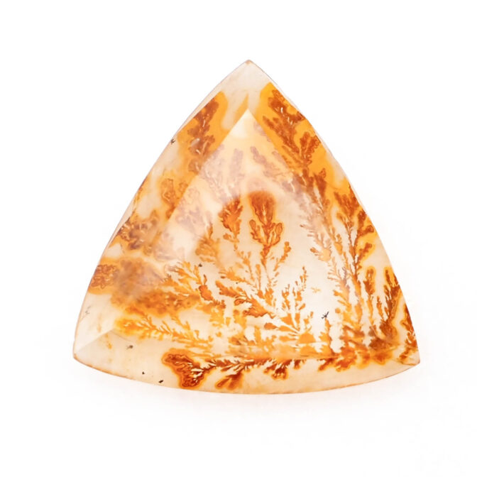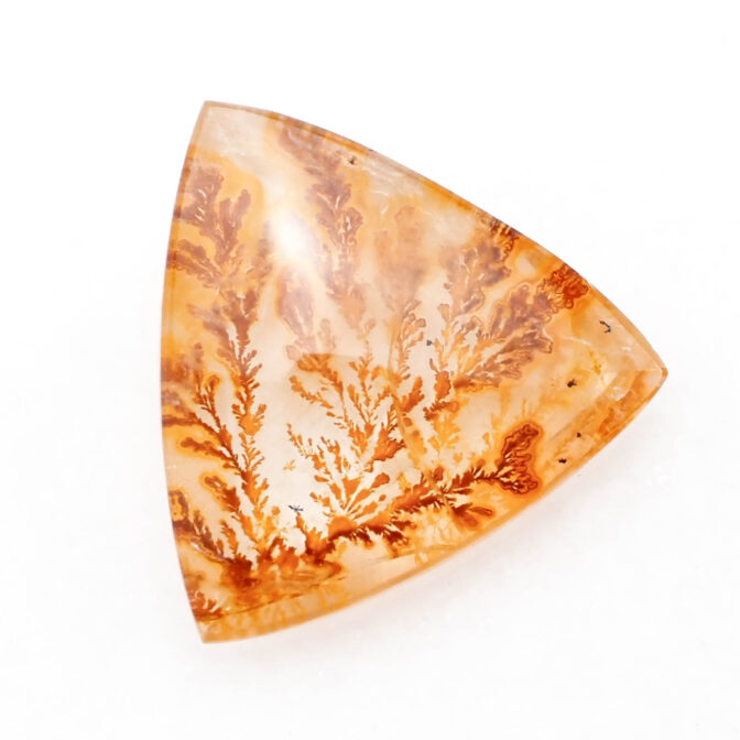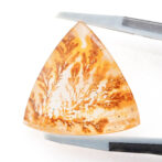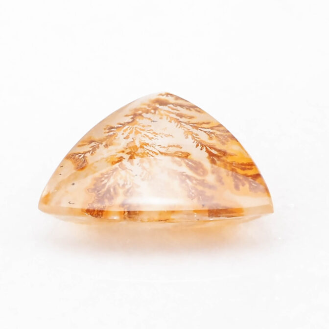 その柔らかにゆらめくインクルージョンの様子から、軟質の珊瑚が海流になびいているかのように見えます。人によっては全く違う景色に見えるかもしれません。ハーバリウムをそのまま石にしてみました、と言われても信じてしまいそう。こんな不思議な光景を宿す石が、つやつやで個性際立つ三角形にカットされていると、斬新な魅力がありますね。