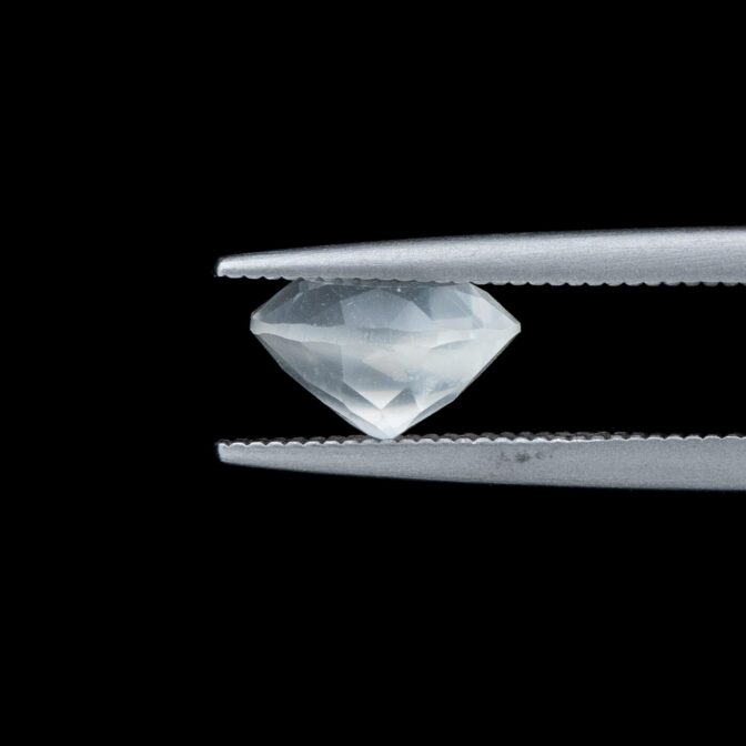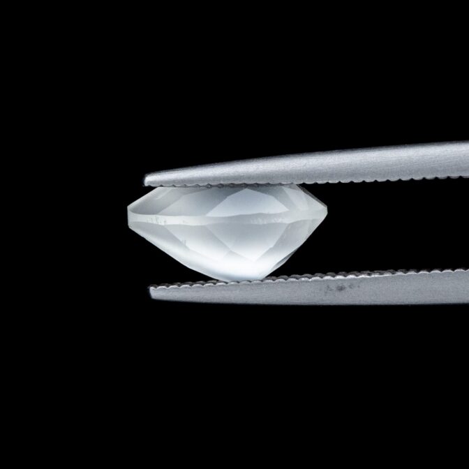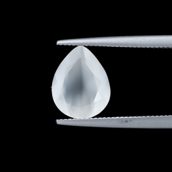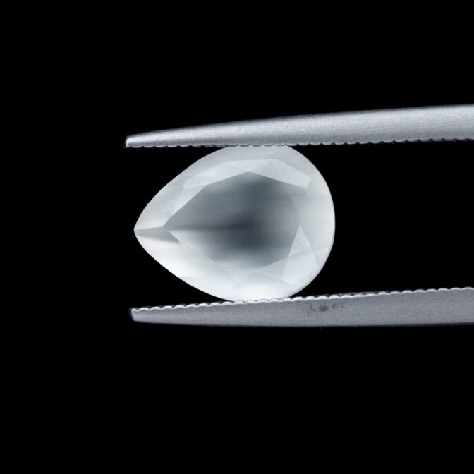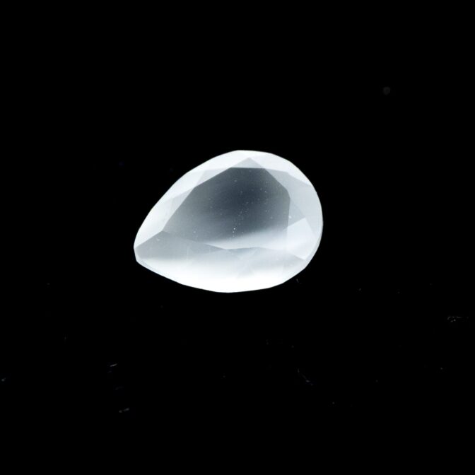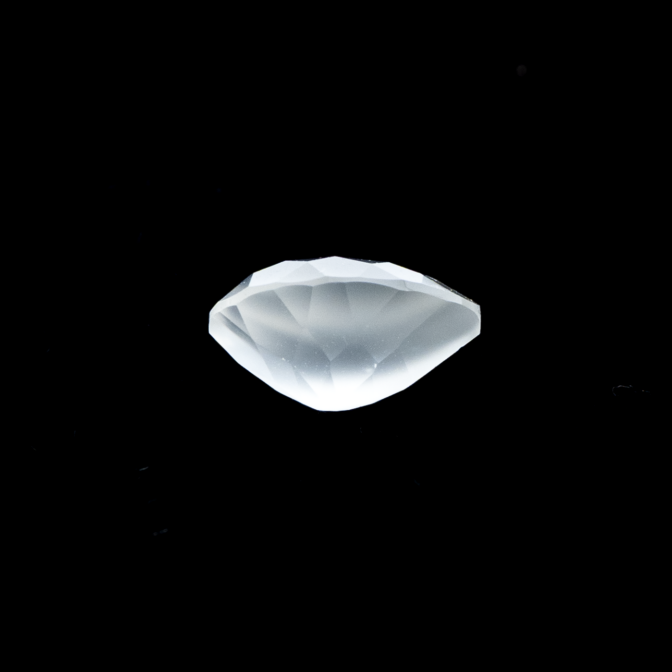 こちらのムーンストーンはとてもスペシャル。何がスペシャルかというと、通常丸くカボションにカットされることが多い中、凝ったファセットカットが施されていることです。水晶ほど硬度が高くなく、鋭いファセット面を出すのが難しいのですが、手が切れそうなほど鮮やかなシャープさで磨き上げられています。加えて均整の取れた見事なプロポーション。これぞ宝石!といえる形の美しさを楽しめます。透明度が極めて高く、インクルージョンがほとんどない奇跡のようなクオリティは光をキラキラと反射し、透明石を圧倒する輝きです。角度を変えるとムーンストーンらしいシラーが石の表面を閃くように横切り、鮮烈な印象を残します。