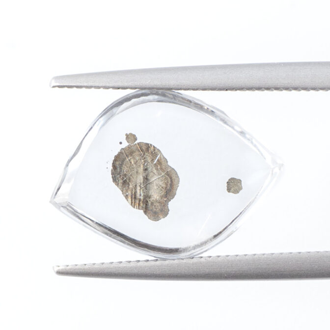 流麗な曲線を描くマーキスカットが優雅なクォーツの中に、はらりとひとひら。まるで迷い込んでしまったような銀色の結晶が可愛いパイライトインクォーツ。パッと見には可愛い、愛らしいが優ってしまいそう。けれども、実は上質なクォーツに施されたシンプルなカットのきらめきと、パイライトの重厚な金属光沢でシックな趣すら感じられます。絶妙な甘辛ミックスで、大人が持つにふさわしいおしゃれなルースに仕上がっています。