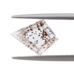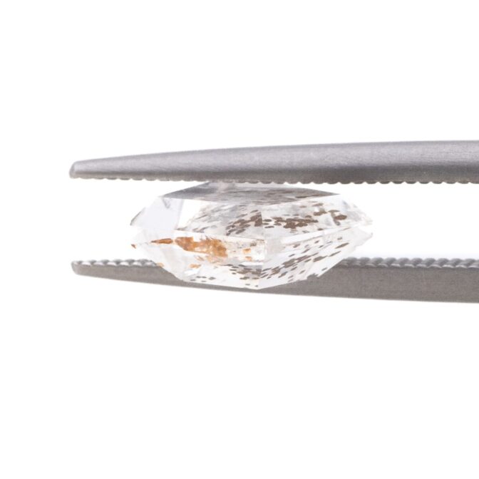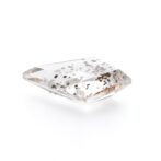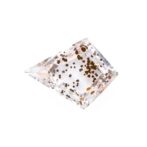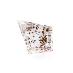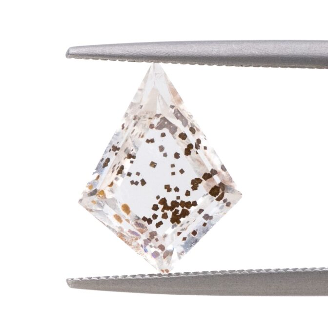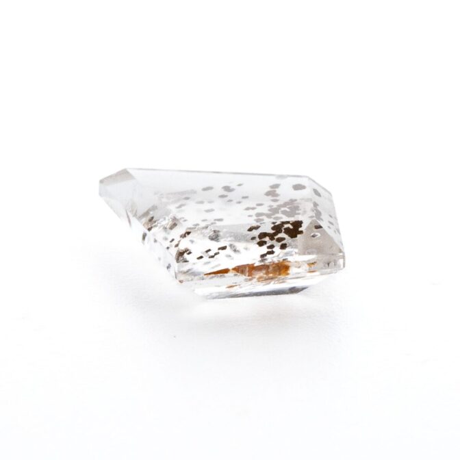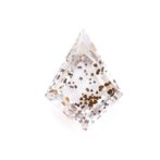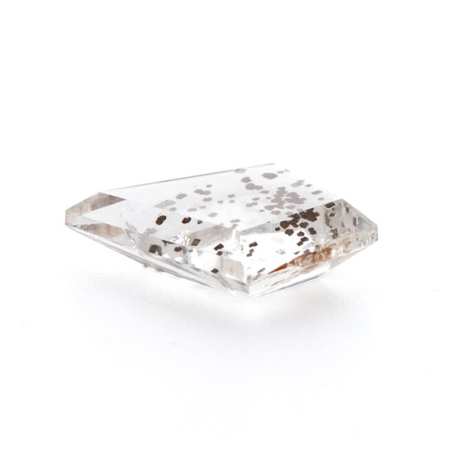 このページでご紹介しているルースは、余計なインクルージョンがない、大変質の良いクォーツに包まれているため、シャープなカットに仕上げられています。インクルージョンが入っているクォーツは純度が落ちるので、ファセットカットに向かないのですが、このパイライトインクォーツは凝ったカットにも耐える質の良さ。インクルージョンを生かすべく広めに取られたテーブル面(表面の平らな部分)は、美しいパイライト結晶を引き立たせます。キリッとした強さを秘めたカイトカットは大変印象深く、宝石としての美しさをもつルースに仕上がっています。