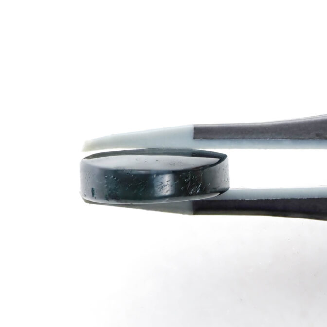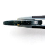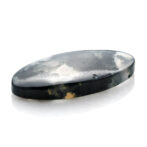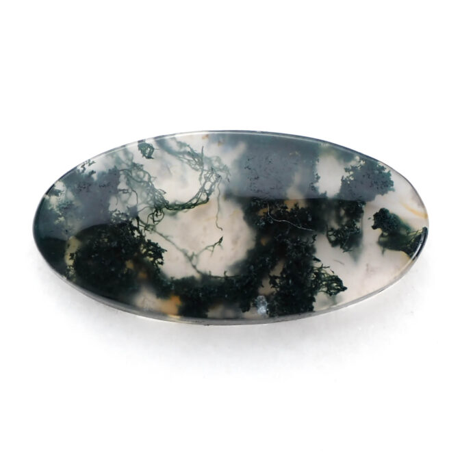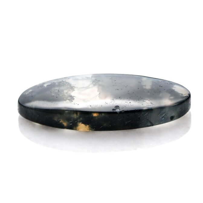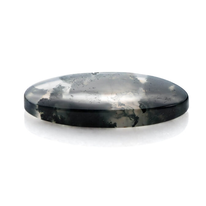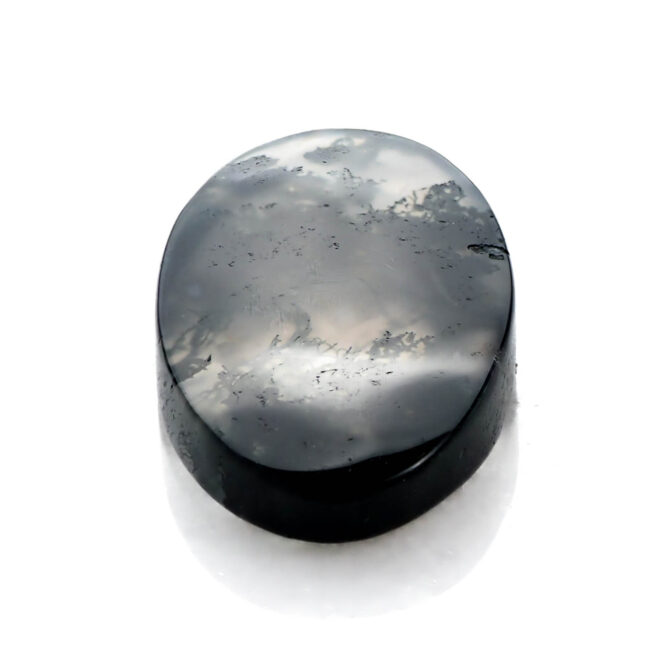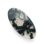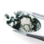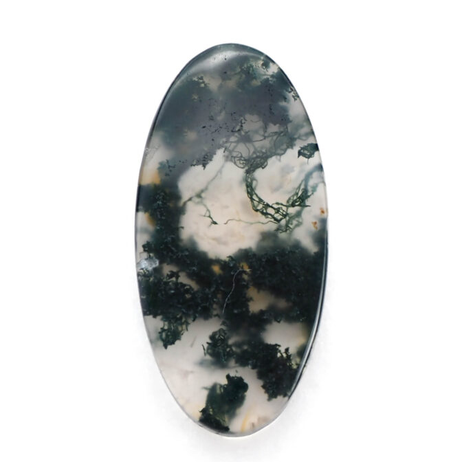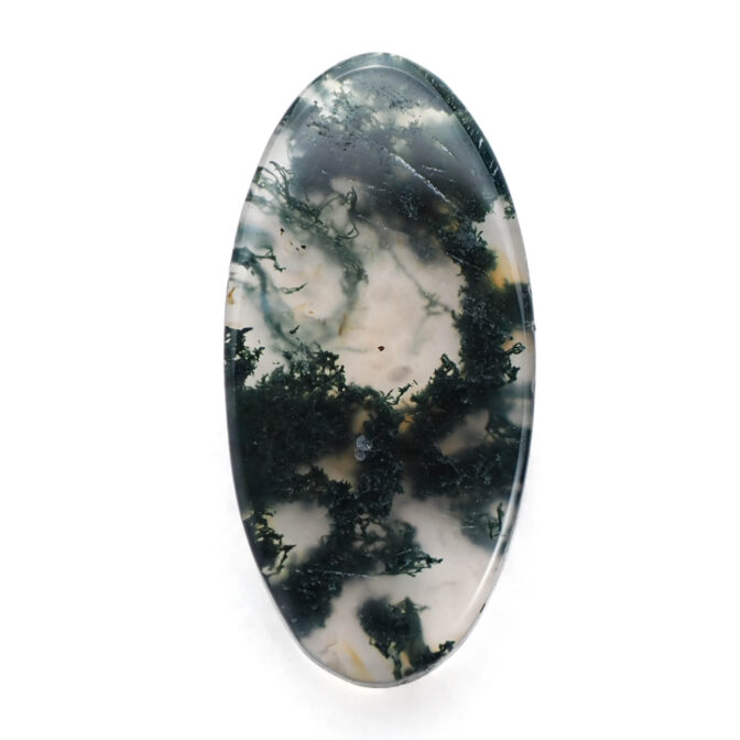このページでご紹介しているモスアゲートは、クォーツと見紛うほど透明感あふれるアゲートの中に、苔にも例えられるディープグリーンのインクルージョンがゆったりと揺蕩っています。ほっそりとしたオーバルシェイプに磨かれ、デザイン性の高いピースに仕上がっています。ところどころに乳白色のふんわりとしたインクルージョンが散らばっていおり、アゲートらしさも兼ね備えたルースです。この模様のバランスは一点ものならではで、他の人と被ることが全くないのも嬉しいポイント。一期一会の出会いは運命を感じさせます。