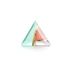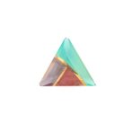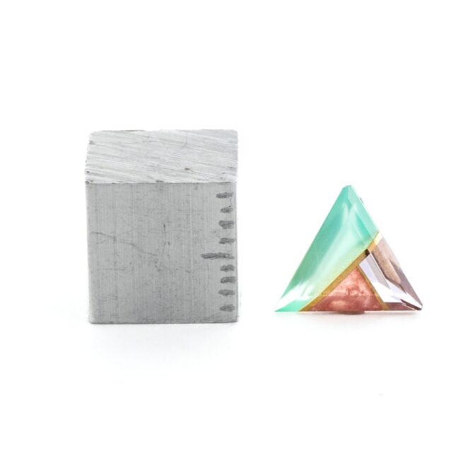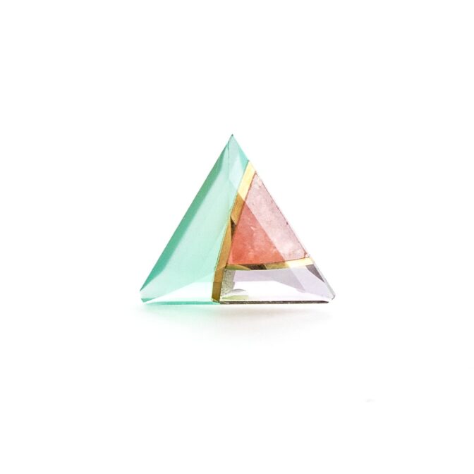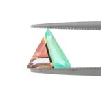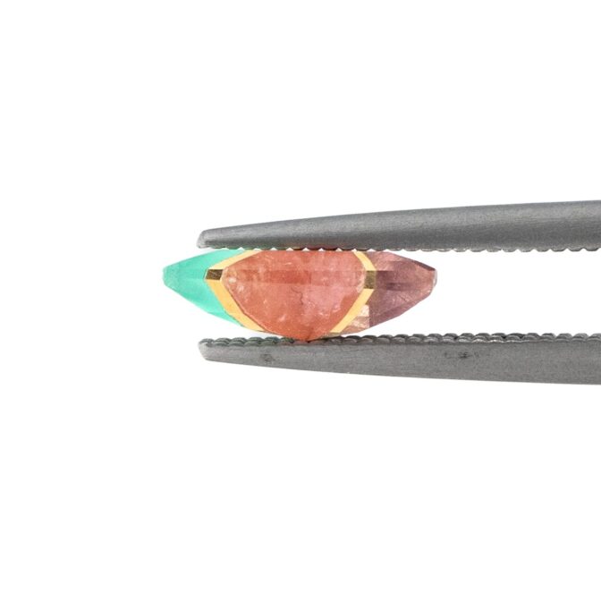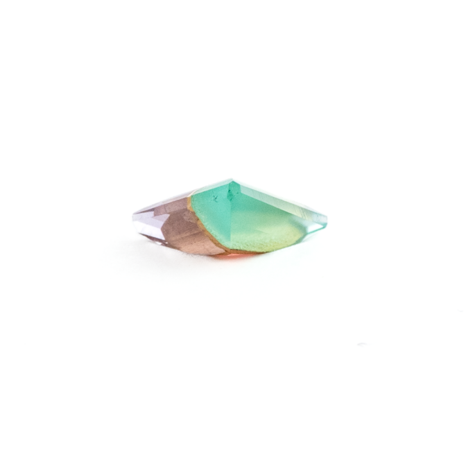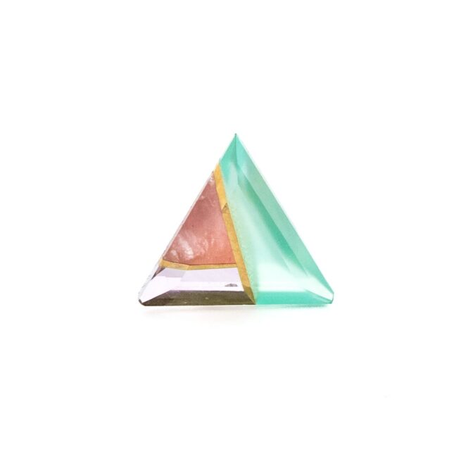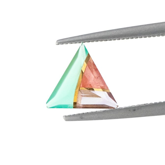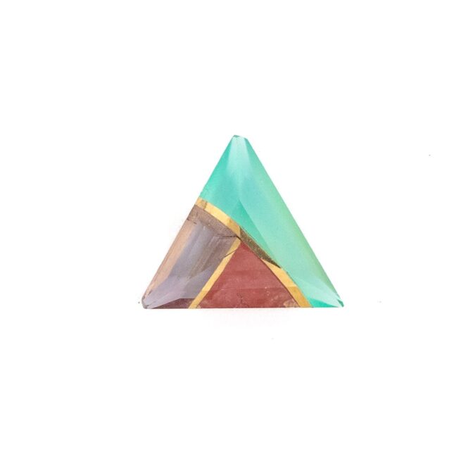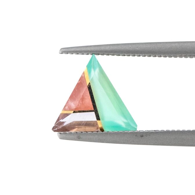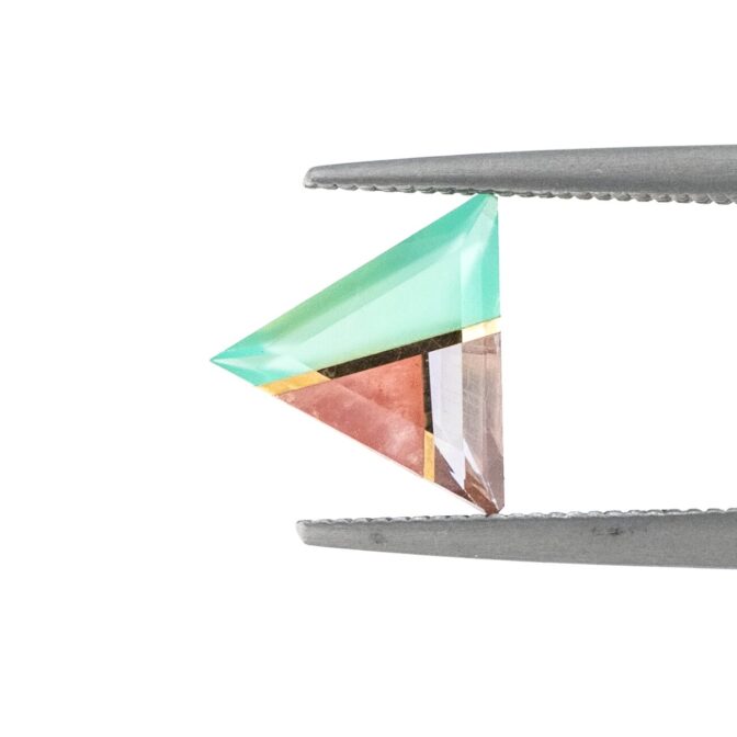 さて、大変整った形のファセットカットのルースであることは事実。でも、情報量が多すぎて、一見するだけでは混乱してしまいます。3色の石が組み合わされ、その継ぎ目に金色に輝くラインが乗っています。色の組み合わせのおしゃれさ、ゴールドの絶妙な配置と面積の上品さに、ひと目で虜になってしまう方が続出するのも納得。使われている石は、クリソプレーズ、ロードクロサイト、アメジスト。3つの石が幾何学模様やモザイクのように精密に組み合わされ、段差や違和感が一切感じられない見事な仕上がりです。