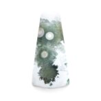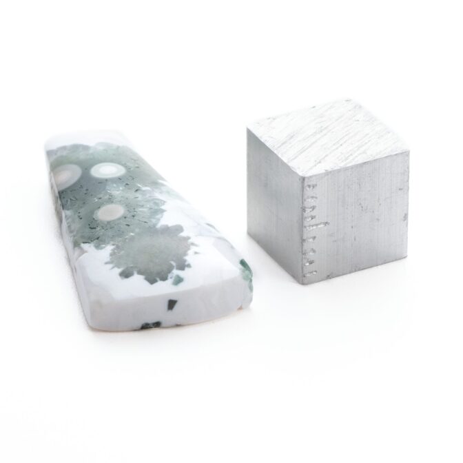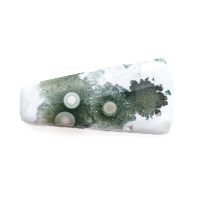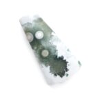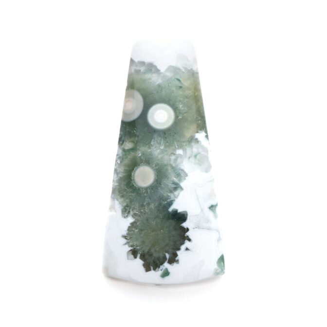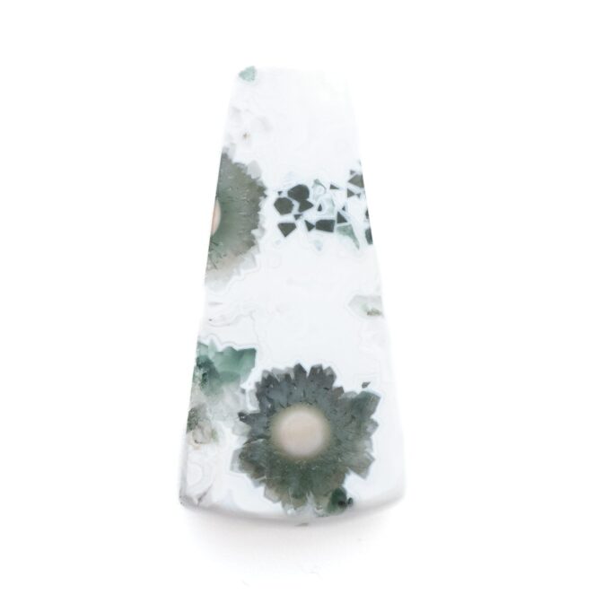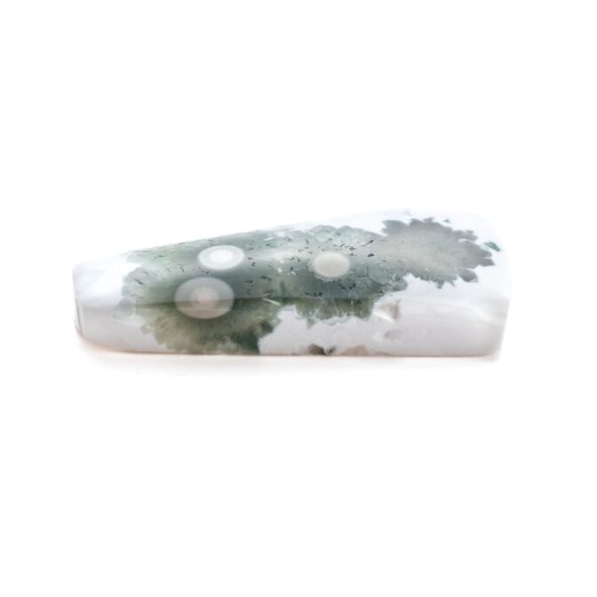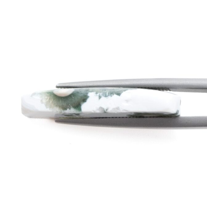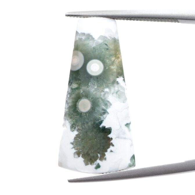 このページでご紹介しているオーシャンジャスパーは、なんとも不思議な見た目でとても目を引きます。マットでピュアなホワイトを背景に、ふわふわとしたグリーンの塊が連なっています。中心には綺麗な同心円を描く水玉模様が。よく見るとふんわりとピンク色を帯びており、可愛いアクセントになっています。このインクルージョン部分は不思議と透明感を帯びており、マット味があるホワイトとの質感の差がとても魅力的。典型的なオーシャンジャスパーのような、そうでないような、ミステリアスな美しさが味わえます。