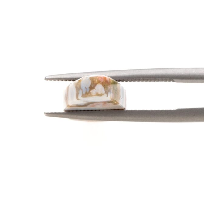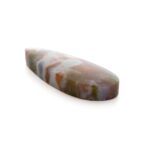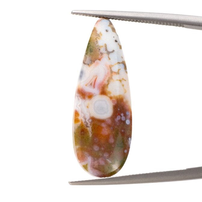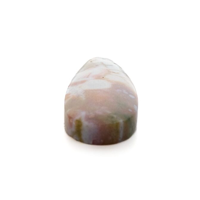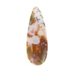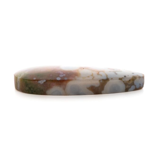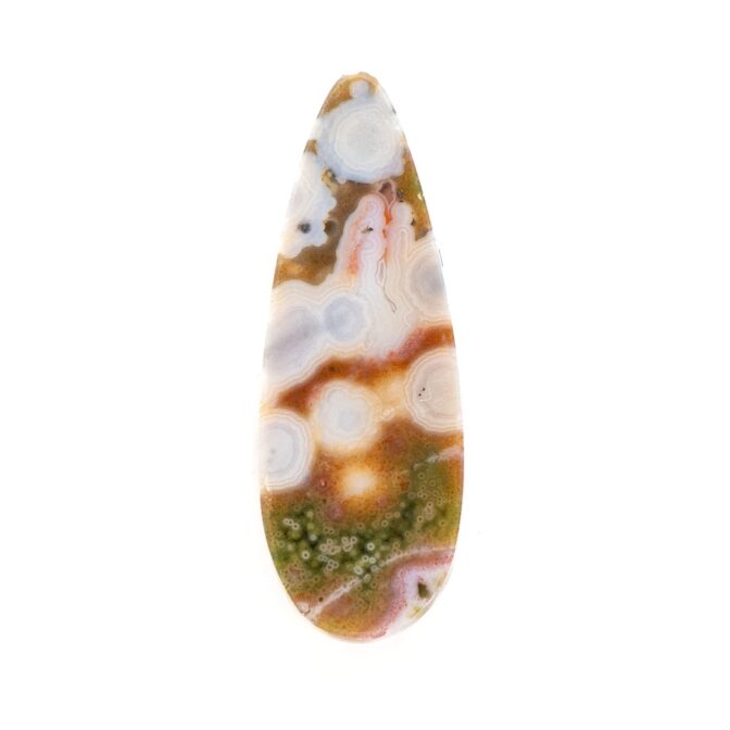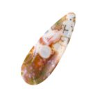 このページでご紹介しているオーシャンジャスパーは、カラフルな水玉模様がポップでおしゃれ。すんなりと細く流麗な形の雫シェイプが、少しピリッとした洗練を感じさせます。シックなカーキ色に優しいピンク色が溶け込み、夢のように可愛らしいカラーに仕上がっています。やや尖り気味の個性を感じるオーシャンジャスパーの中にあって、こんなにもまろやかで穏やかなルースはちょっと珍しいと思います。それでいて華やかさもあり、つややかに磨かれて潤んだような輝きを放ちます。和の趣を感じさせる情緒あふれる美しさは、どんな人の心にも温かく響く美しさです。