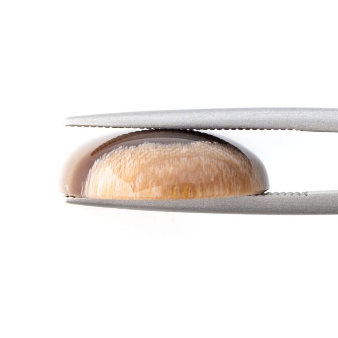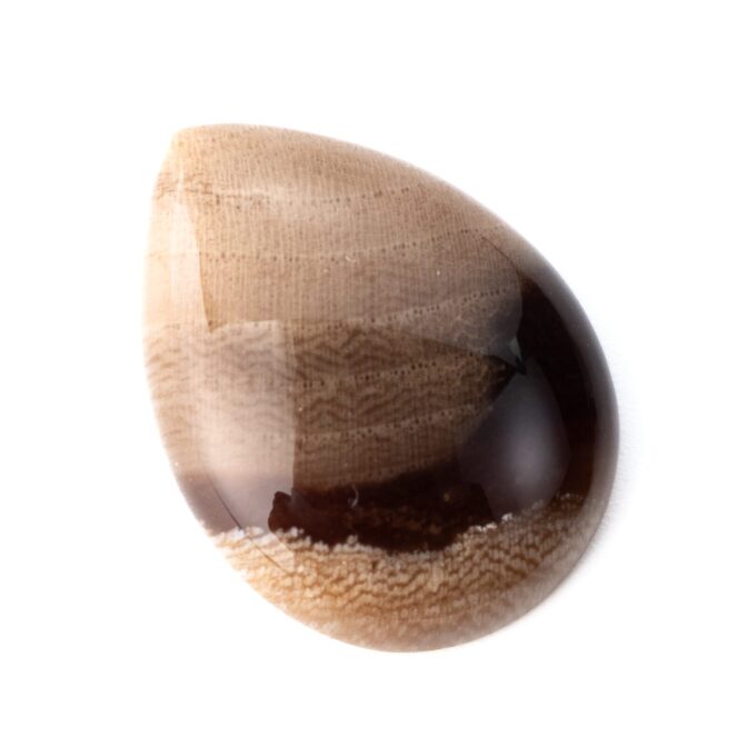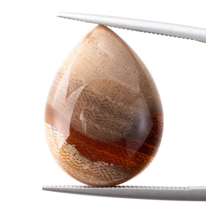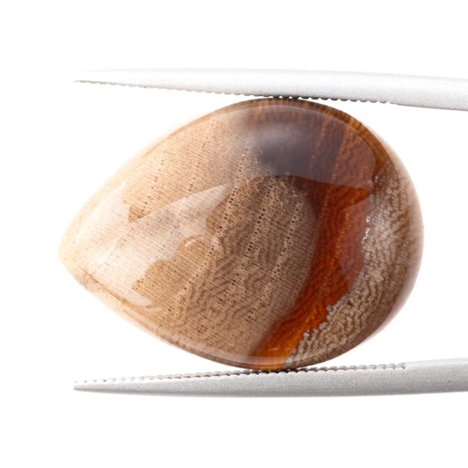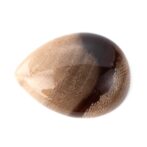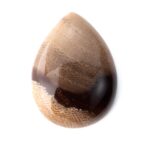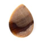 色と模様がグラデーションのように連なり、砂つぶのような質感は砂漠の景色のよう。つやつやに磨かれ、ふっくらとした曲線を描く雫の形にちょうど良く収まっています。一見すると地味なようですが、アゲートらしい潤んだような輝きと、複雑な模様、そして流れるように色を変えるグラデーションが洗練された魅力。こんな感じのルースは、ジュエリーにするととてもおしゃれなんです。ぷりっとした形ですが、厚みがないので大粒天然石ジュエリー初心者の方にもおすすめです。