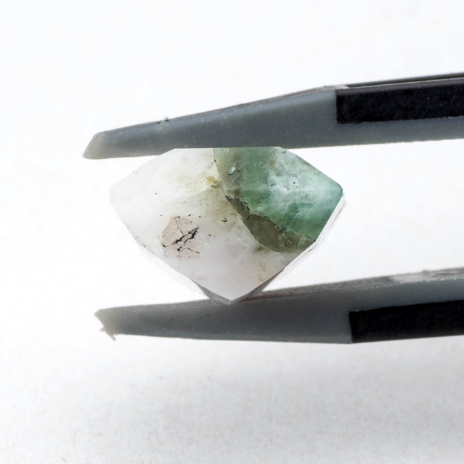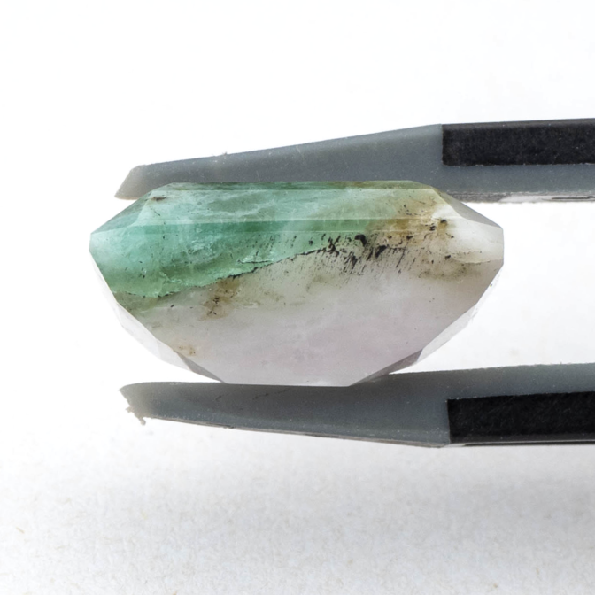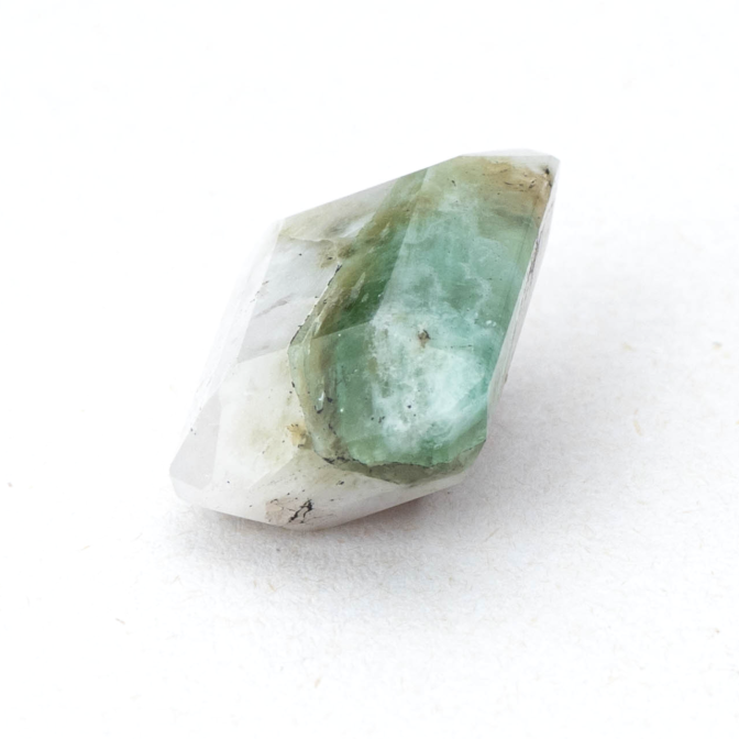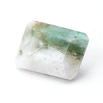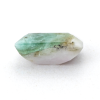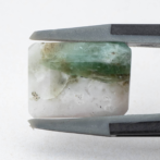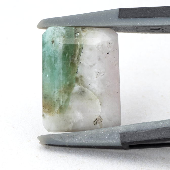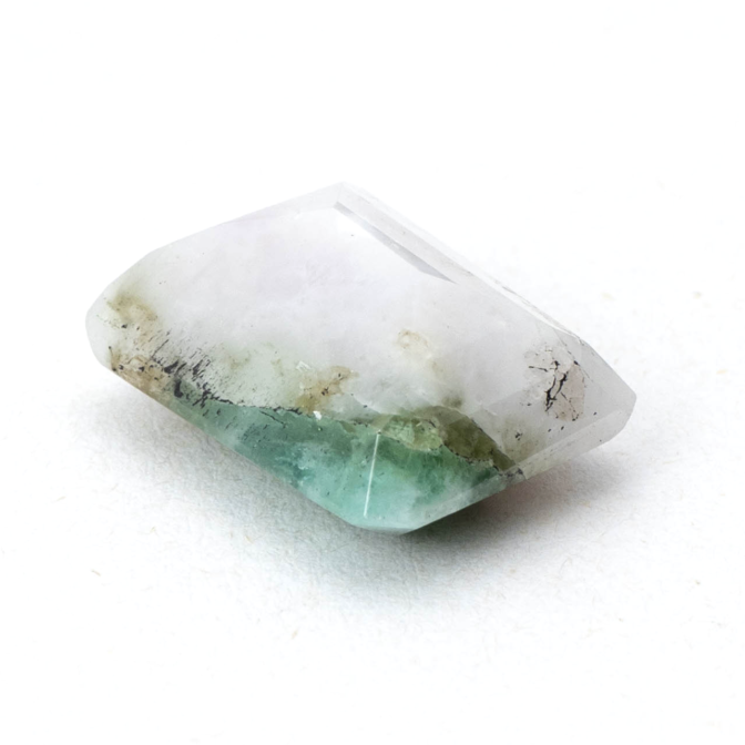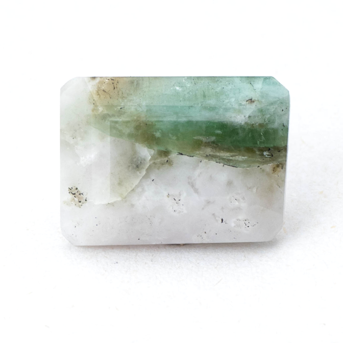 端正にカットされた白いアルバイトの端の方に、エメラルドのグリーンが流れるように走っています。淡いグリーンから濃いグリーンへのグラデーションが美しく、モードな雰囲気。エメラルド部分の透明度が高く、白くもこもことしたアルバイト部分が透けて見えるのがとても面白いルースです。