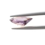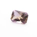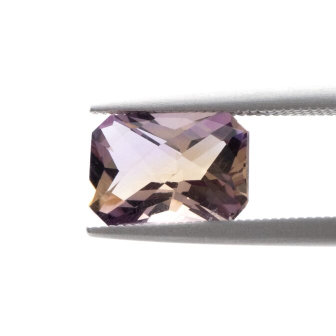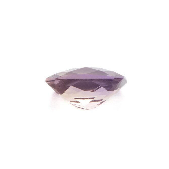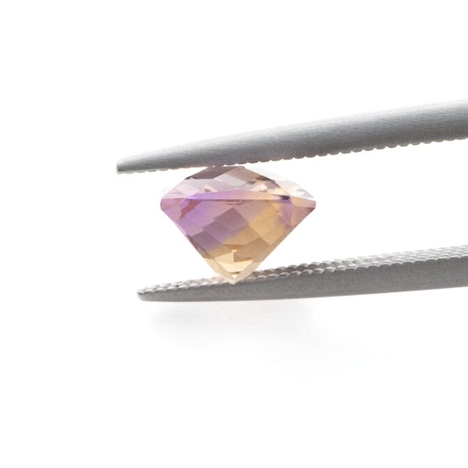 今回入荷したアメトリンも上品な美しさはそのままに、手の込んだカットによって魅力が倍増しています。表はシンプルなチェスカット。裏はシザーズカットと呼ばれ、対角線上にXの形に面が入っています。この2つのカットの組み合わせは、ルースの内側から溢れんばかりの輝きを生み出します。特にこちらのルースは照りがよく、紫とイエローが絶妙にミックスされたきらめきに幻惑されてしまいそうです。色がはっきり分かれているわけではなく、見る角度によって紫が強く見えたり、イエローが眩かったり。気まぐれな色と光は飽きのこない美しさです。
