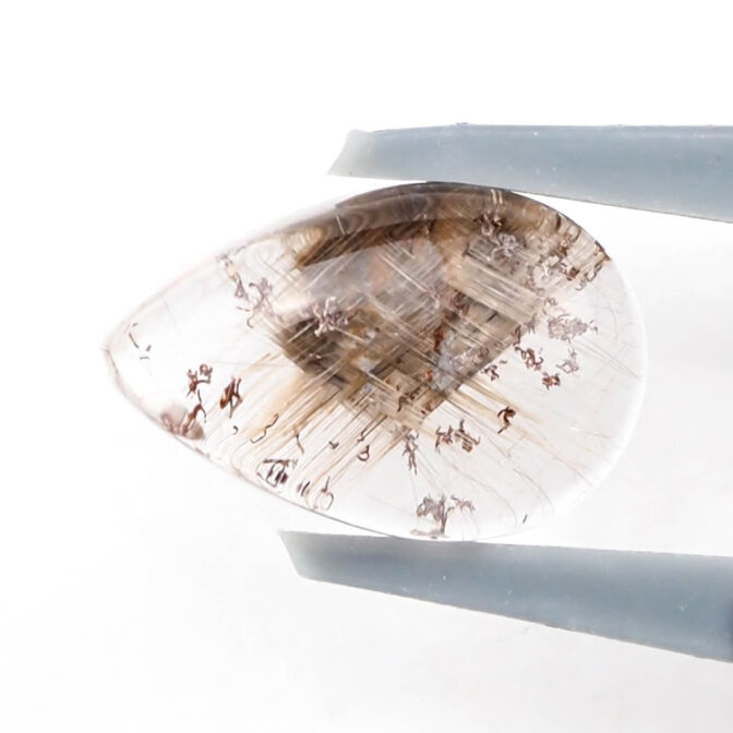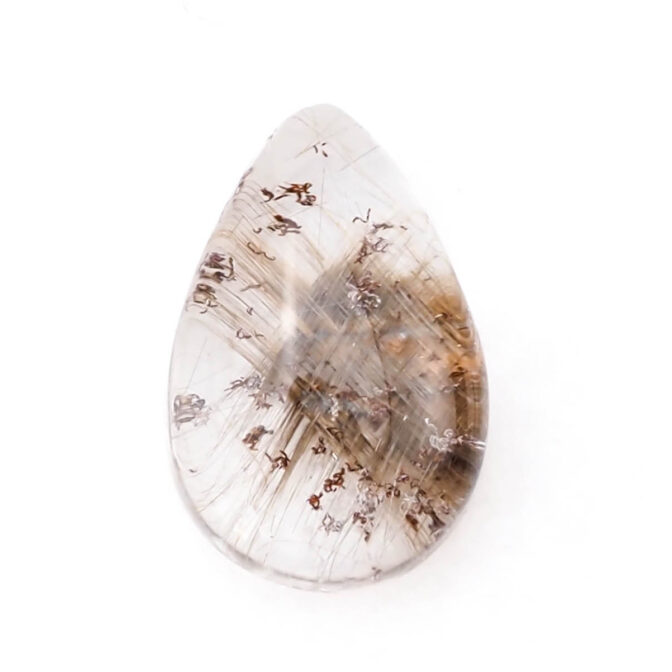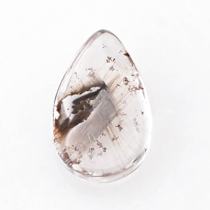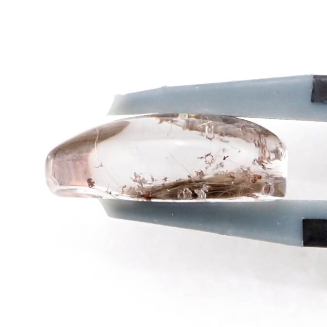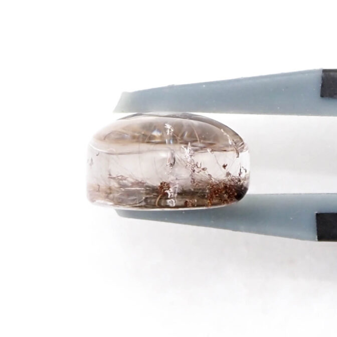 緊密に詰め込まれたプラチナルチルはともすれば重々しく見えがち。適度な面積のクリアなクォーツが抜け感を作り出し、絶妙に軽やかかつおしゃれなルースに仕上げられているのも心惹かれるポイントです。紅くメタリックな輝きを放つ粒状のインクルージョンが見え隠れし、可愛さを添えるアクセント。花びらを散らしたような華やぎを添えています。