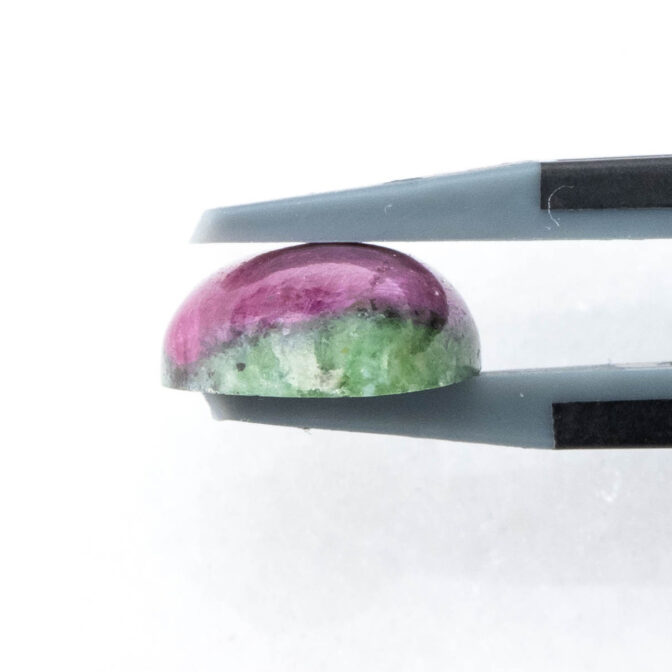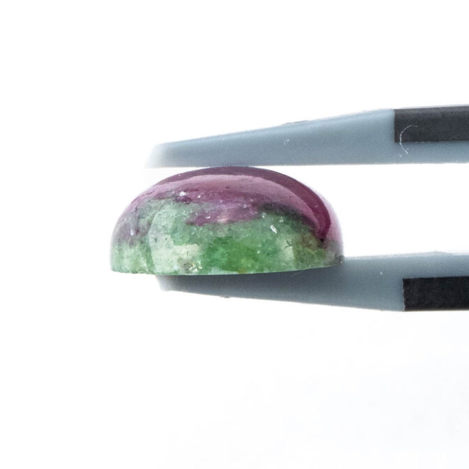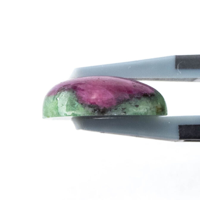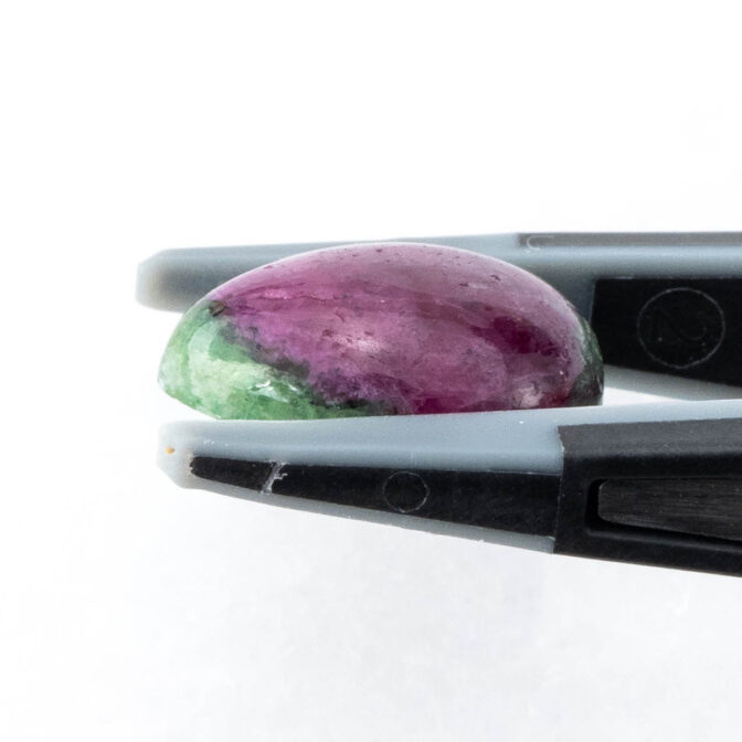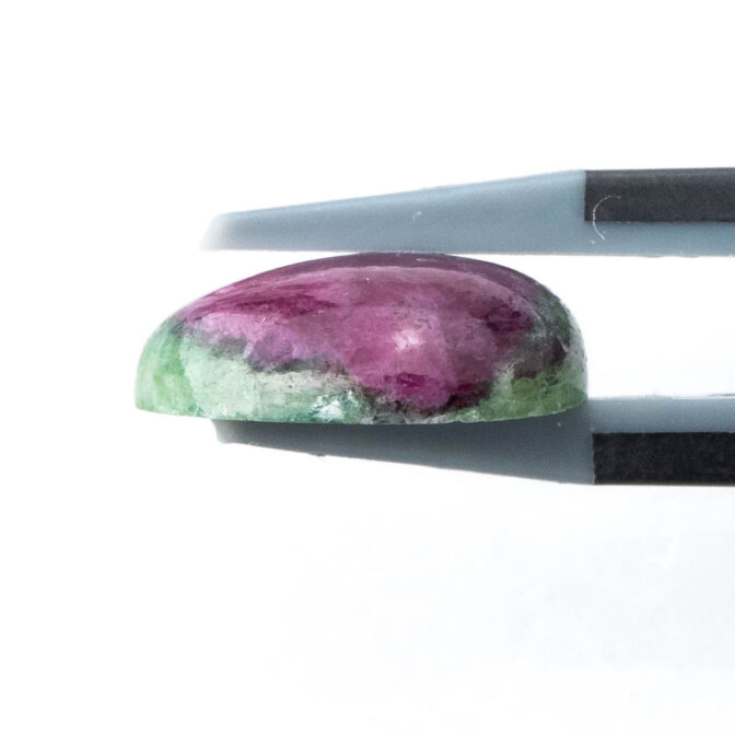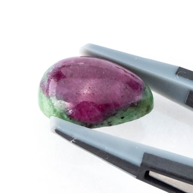 ゾイサイトとは、12月の誕生石にもなっているタンザナイトと鉱物学的には同じ石です。現在では、ゾイサイトよりブルーのタンザナイトの方が知名度が高く、人気の的。けれども、もともとはタンザニアで不透明なルビーとグリーンのゾイサイトが最初に発見、産出されるようになり、その色のコントラストの美しさから人気を博したという歴史があります。もちろん、今でもその色の美しさからコレクターに人気です。しかしながら、ルビーとゾイサイトの金剛石であり、高度の違いが大きいため研磨が困難。美しい形のルースに出会うのは困難を極めます。
