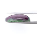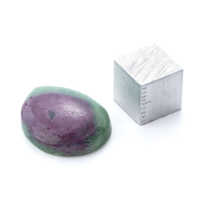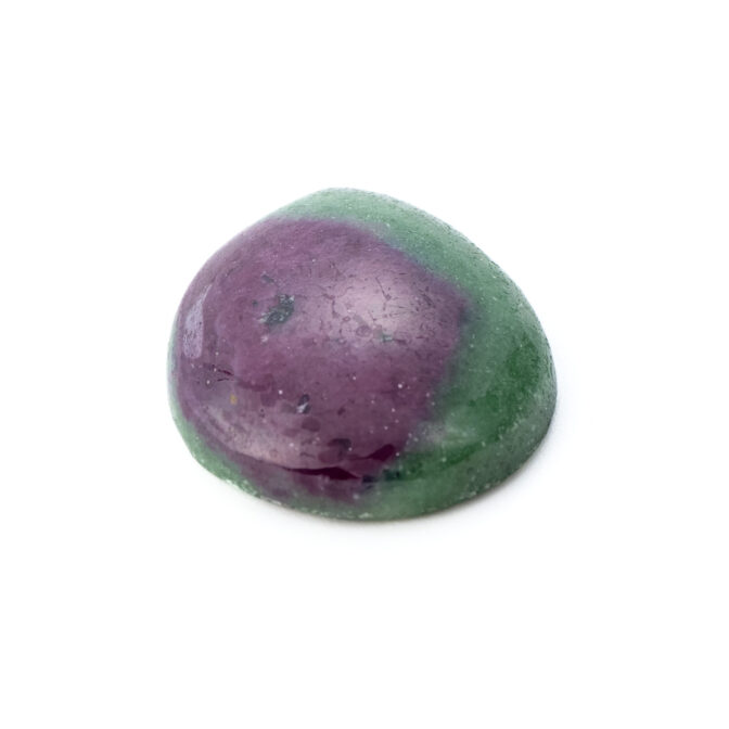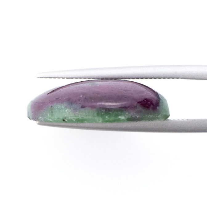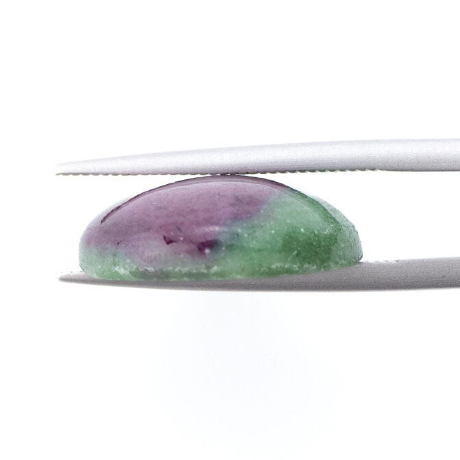 ゾイサイトとは、12月の誕生石にもなっているタンザナイトと鉱物学的には同じ石です。現在では、グリーン寄りの発色であるゾイサイトより、ブルーのタンザナイトの方が知名度が高い傾向があります。けれども、もとはタンザニアで不透明なルビーとグリーンのゾイサイトが最初に発見、産出されるようになり、その色のコントラストの美しさから人気を博したという歴史があります。今でも色の美しさからコレクターに人気ですが、ルビーとゾイサイトの混合石であり、高度の違いが大きいため研磨がなかなかに厄介。美しい形のルースに出会うのは困難を極めます。