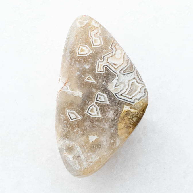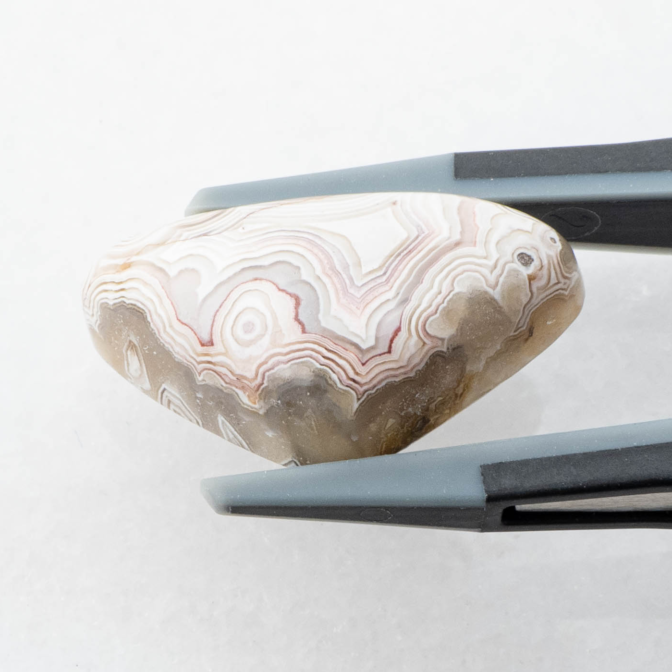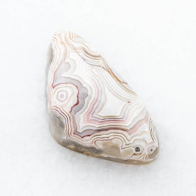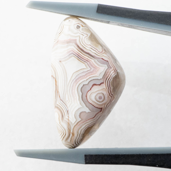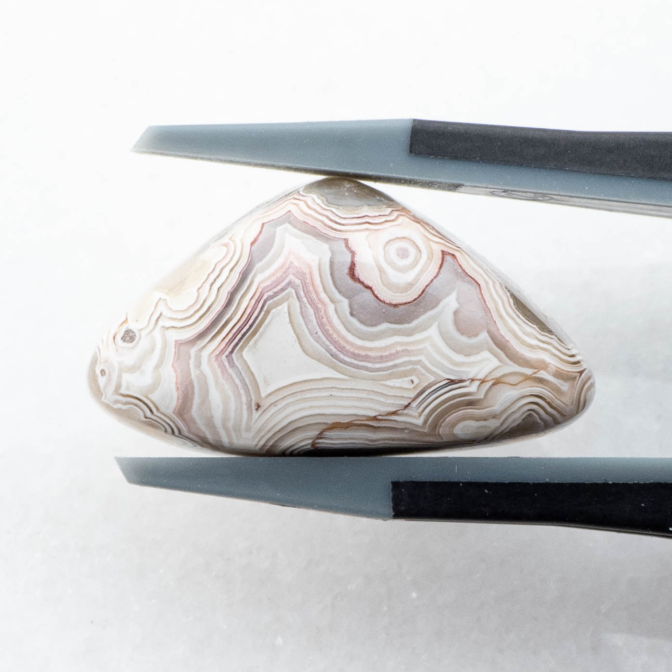 このページでご紹介しているクレイジーレースアゲートは、模様の美しさを最大限に活かすようにランダムにカットされ、曲線で構成された三角形に仕上げられています。形と模様の面白さを楽しむルースで、丁寧にツヤツヤになるまで磨かれている研磨の良さもポイント。しっかりと密度があるルースなので、ジュエリーに仕立てるのもおすすめです!